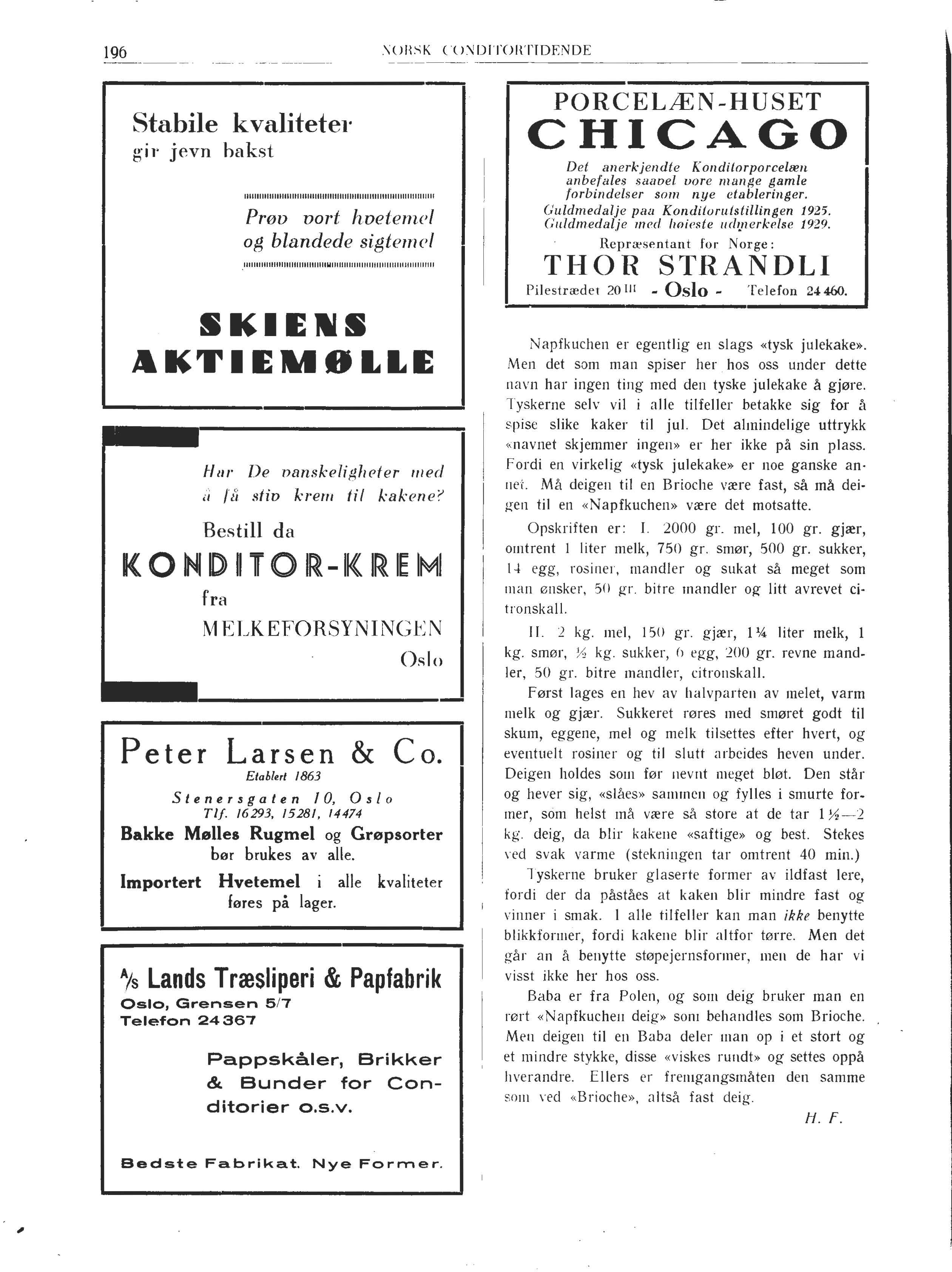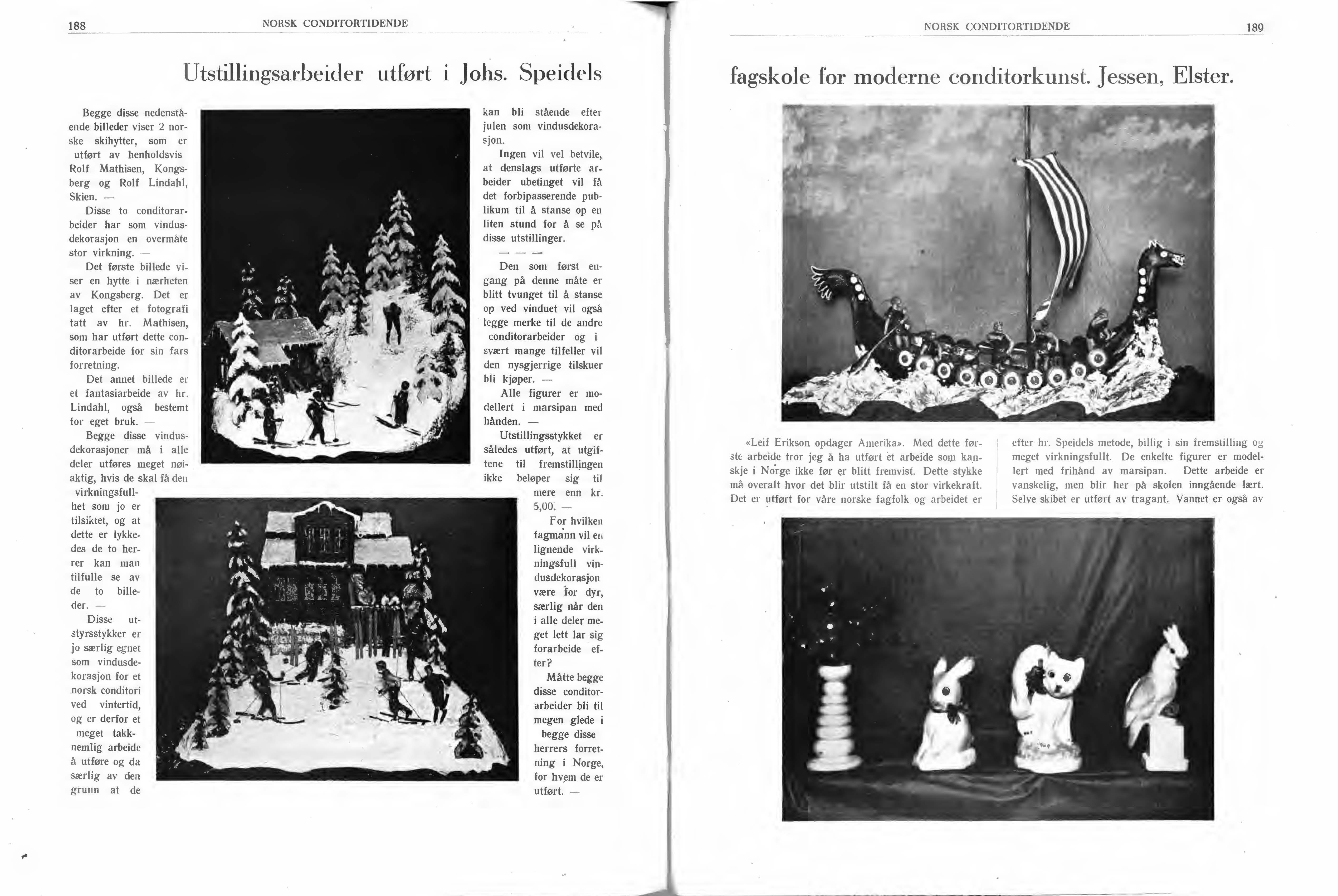 Det annet billede viser sukkermeislingsarbeider. Disse er sva1d farvelagt. Denne spesielle utførelse blir bare fremstillet ved Speidels skole. Ved siden av dette kunstarbeide blir også det praktiske arbeide spesielt pleiet. Dette viser de mange arbeider som har stått i «Norsk Conditortidende». De mange norske fra alle deler av landet som har besøkt Speidels fagskole, har alle vel fornøiet reist tilbake til Norge. Da hr. Speide! personlig har arbeidet en lengere tid i Norge, så kjenner han forholdene i alle landets deler ganske godt. Dertil er alle arbeider avpasset efter norske forhold. Jeg er sikker på at der for oss norske for tiden ikke gis noen bedre fagskole enn Speidels, som ved hans personlige undervisning gir det beste resultat for hver enkelt elev . Jeg vil også gjennem «Norsk Conditortidende» få takke hr Speide! for alt hvad jeg har lært ved hans skole, jeg vil på det beste anbefale alle mine norske kolleger skolen som helt førsteklasses.