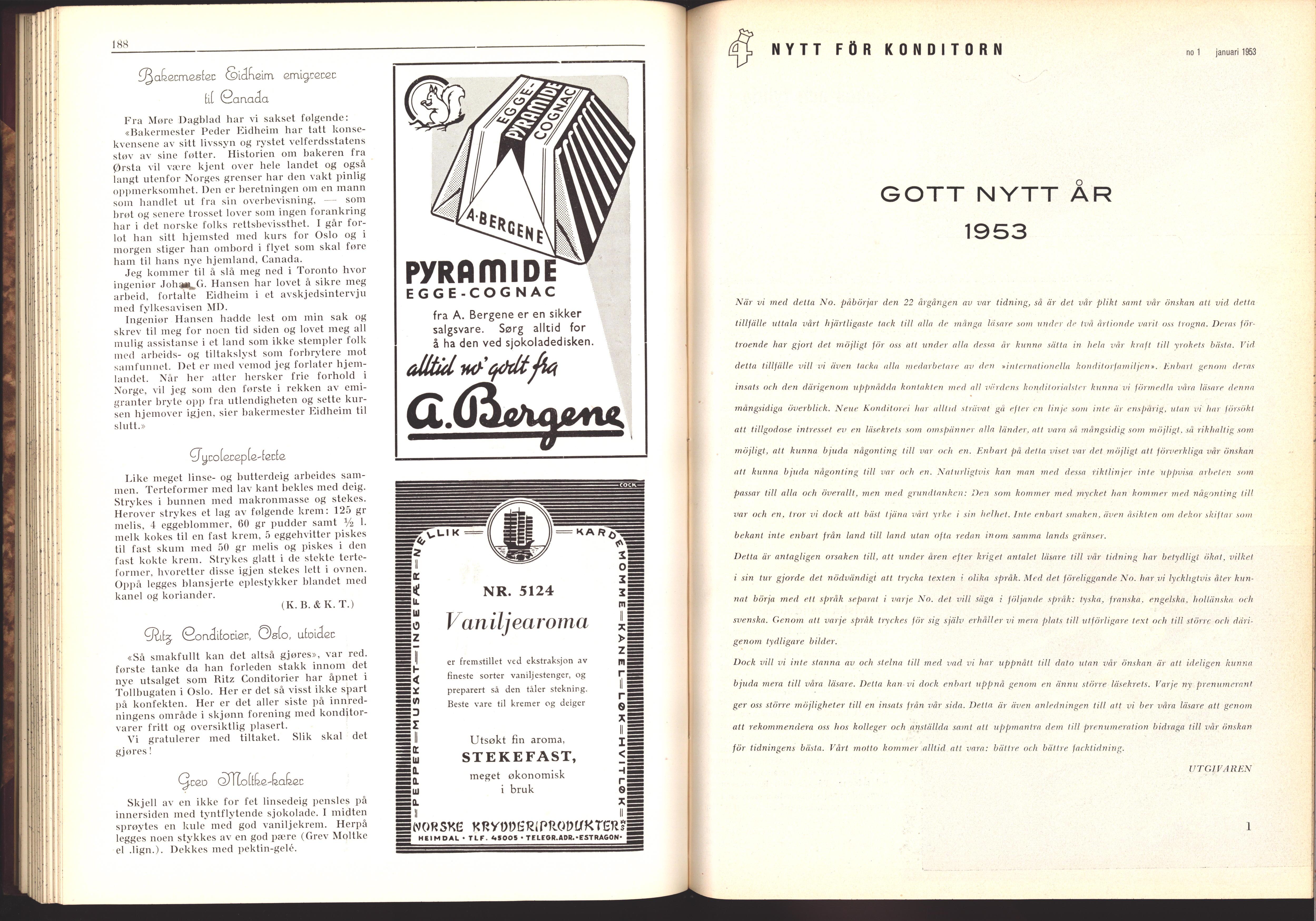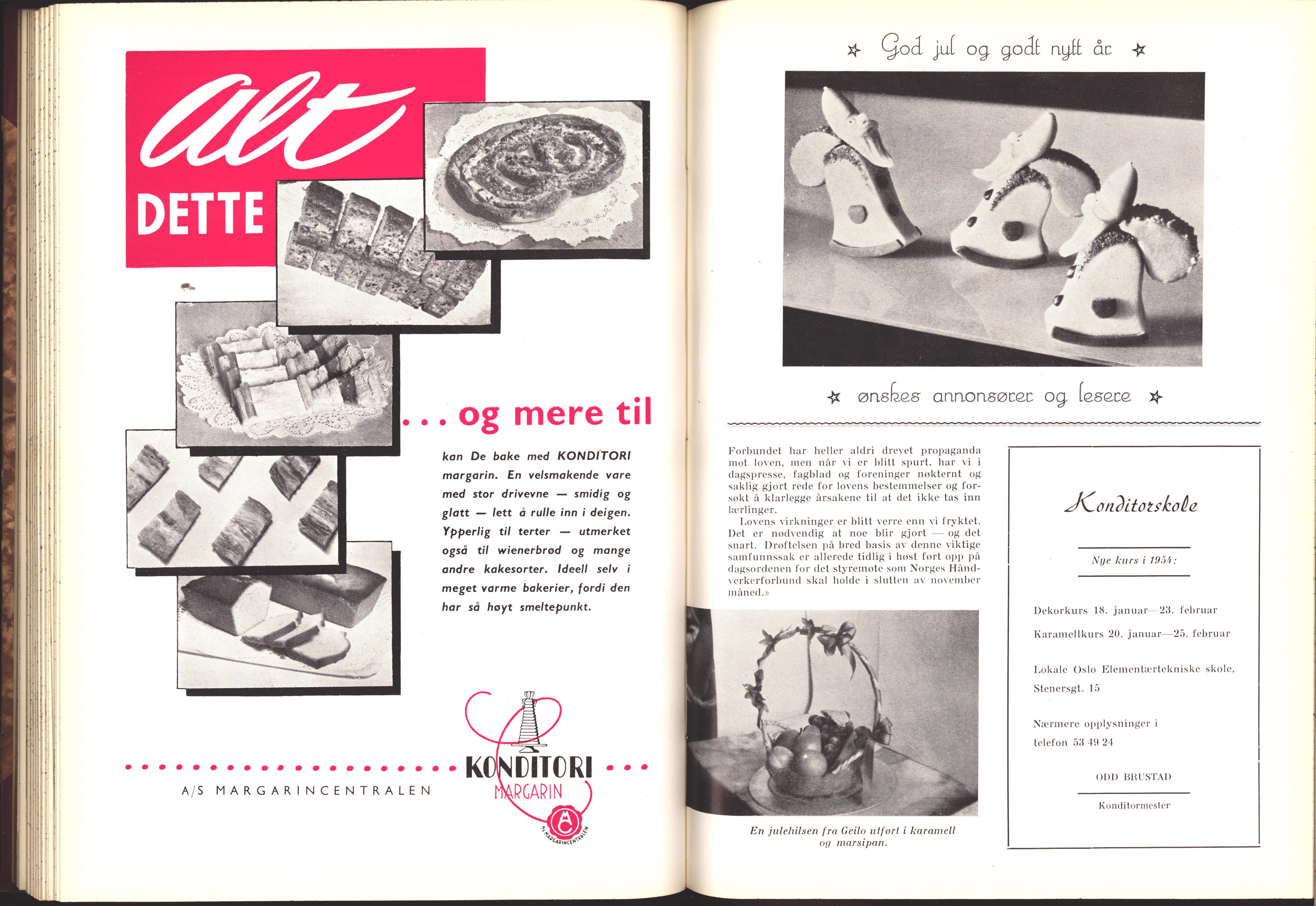Jul var i hctleu<lourulen navn pfl eu fest som feircrles ve<l sAkalt <blot> mitltvinterstitl (12. januar). Hflkon den s-ode fikk den henlagt til 25 descmbcr, o.qetter kristcnilommens innf@rclse blc julen en fest til nrinne ont Frelserens fldsel. Jtllcn regner man dog fl vare i 20 ttager. Med jtllen var oS- cr det fremdeles forbundet nreg-en overtro. Grunnforestillingen er at de overnaturlige vesencr hadde uh1're makt ovcr menneskene i flreti m@rkeste tid. I julenatten vender de avdOde tilbake til sin gamle bolig. Alle antlre vetter mAtte holdes borte fra folk og fe ved tjerekors over d/rene. Serlig fr-vktet man det store tog av overnaturlig-e vesener som dro fra gird til gird f-or A stjele Ol og mat, tlerav stammer det isrer pfl landet kjen-te, h Sa.jutebt,Lk. I dansk folketro cr Otlin, f0rer for toglt, i norsk Gutlrun Rysserova, eller trollet <Trond>>' Oskoici. ellcr som vi niest kjenncr ttnder navnet Asgirdsrci, ct ridentle f/lge av Srntler,.som ferdes utcr iim nettene, srerlig ved jirletidcr. Til julen h/rte ogsA mcgen l,ldrihking. .Tule@let var det bcste og stcrkcste oS'pAla lovcn liver bonde med tninst scks k,i@r & bivise en viss meng-tle 0l og fl holde juleglltlc. Mens ,"d-rr.g" av de gamle shikker forlengst er forsvtlnnet har ilcr .erere-festnet scg en ny skikk: juletreet. Vi -Ot.i a"t f6rst i Tyskland i 17. irh. Omkrins- 1800 filik det innpass i Danmark. Omrking- 1850 ble brui'", ur. julctie alminnelig i Norge' Alle gleder seg til julens komme. I)en skaper liv og r@relse, sfl vel i h jemmcnc som i betlriftcr, omsetnin-gen tlkes, tlen ri.up.. glede oil- l-vse minner. For bakerc (lg k(I?ditorer ci.tlct ct-svarc strcv rncrl fr ffl alt l'erdig. Ikkc rninst konditorenc tenkcr tilbalic til svtrndne tider med forscrt arbeid ettersom dagcne nrermct seg julen' ltar.sipanarbcitlet var jo dct viktis-stc. AI-l.c gjorde silt bcste 'for fl frcmstillc tlct pencste. Kontlitorvintltlcnc var allc rcne kunsttttstillingcr i marsipan og annet ;,1-orlt. I)essverrekrigen stoppct alt.I krigsArcle iiLt ott sont tlet best liunnc, senere er <ler suksessivt Biiii i"iti", mcn rAstoffene cr dt-rc, frrls-cliil- mi ogsA tlet ferdige produkt bli tll'rt. .Ia, konditorer av eltlrc i-.s*s"i"-innes nok meil vcmod den forgangne tid, ett-er ill sansynlighet en tid som aldri mer kommer tilhakc.