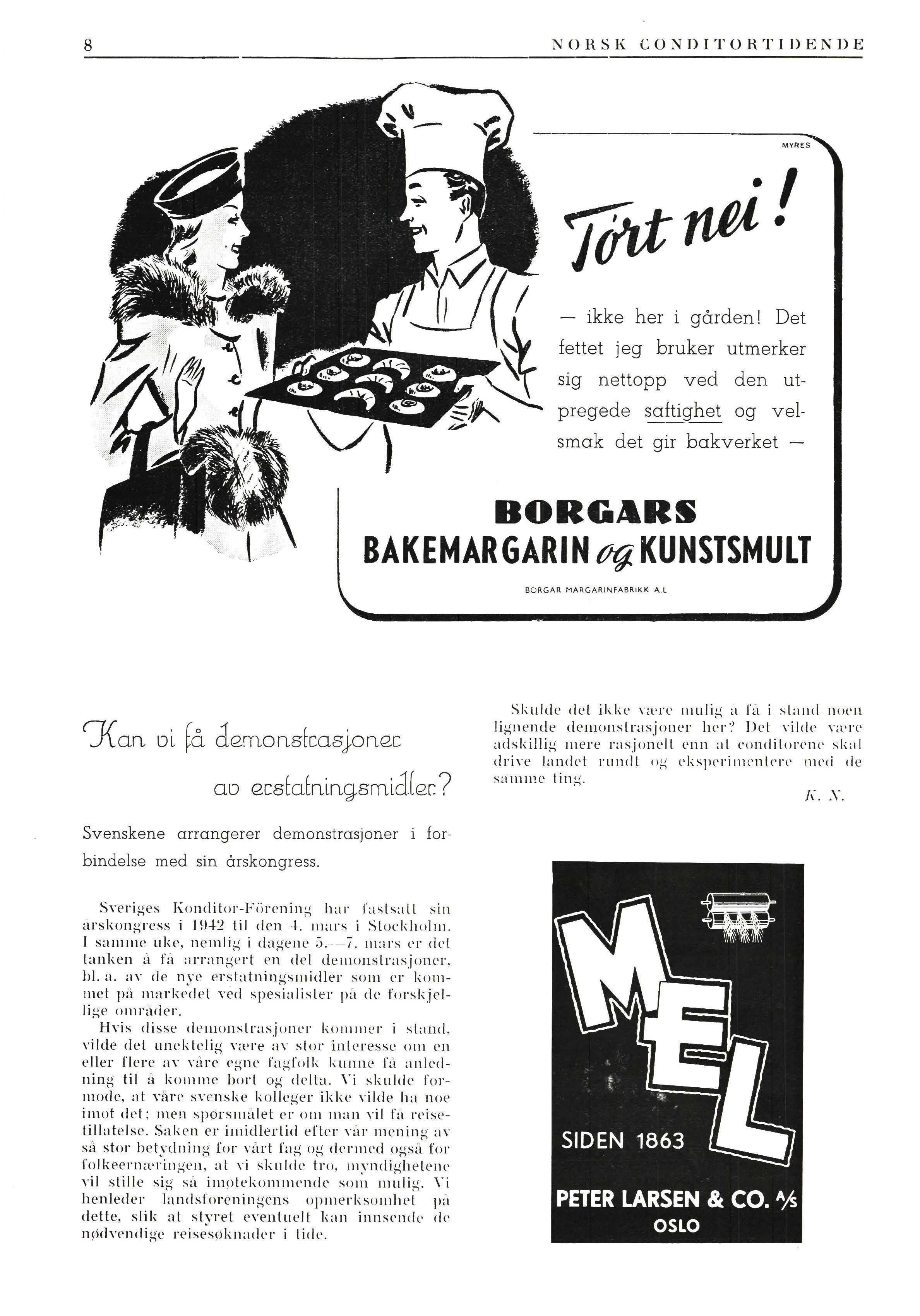 Swrig e s h:onditor-Fiirening har l':tstsall s in :irskongress i I H-1-'.2 til den -1-. 11wrs i Sluckhu\111 . I sa1111ne uke , nemlig i dagene J. 7. nwrs er del lanken a fa ;,rrangert en del d e 1nonslrasjoner , hl. a. aY ele nye erstatningsmidler son1 er kommet p t1 markedet Yed spesialister pit de forskjellige 01nrader.