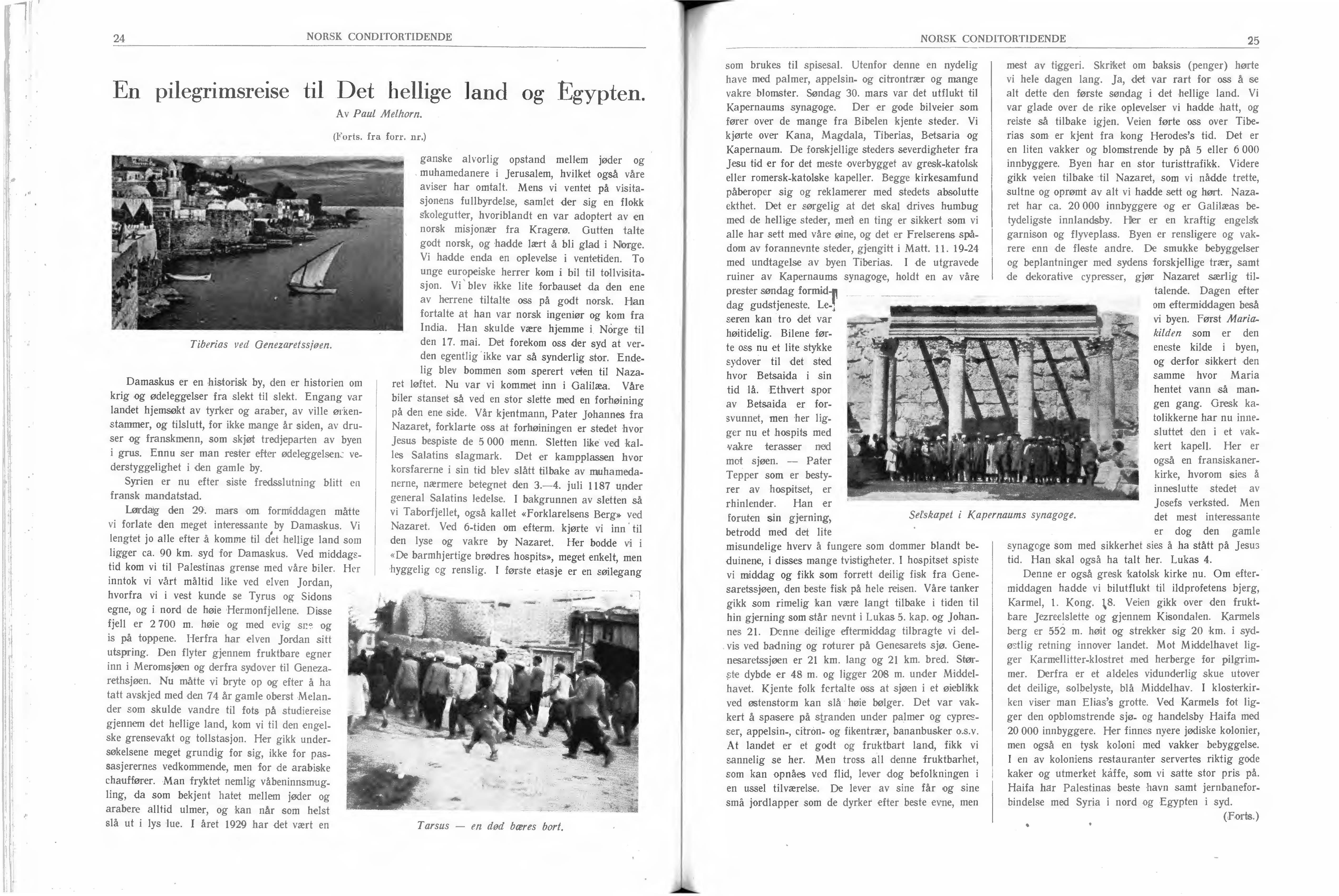 mest av tiggeri. Skriket om baksis (penger) hørte vi hele dagen lang. Ja, det var rart for oss å se alt dette den første søndag i det ,hellige land. Vi var glade over de rike oplevelser vi hadde hatt, og reiste så tilbake igjen. Veien førte oss over Tiberias som er kjent fra kong Herodes's tid. Det er en liten vakker og blomstrende by på 5 eller 6 000 innbyggere. Byeri har en stor turisttrafikk. Videre gikk veien tilbake til Nazaret, som vi nådde trette, sultne og oprømt av alt vi hadde sett og hørt. Nazaret har ca. 20 000 innbyggere •og er Galilæas betydeligste innlandsby. Her er en kraftig engelsk garnison og flyveplass. Byen er rensligere og vakrere enn de fleste andre. De smukke bebyggelser og beplantninger med sydens forskjellige trær, samt de dekorative cypresser, gjør Nazaret særlig tiltalende. Dagen efter