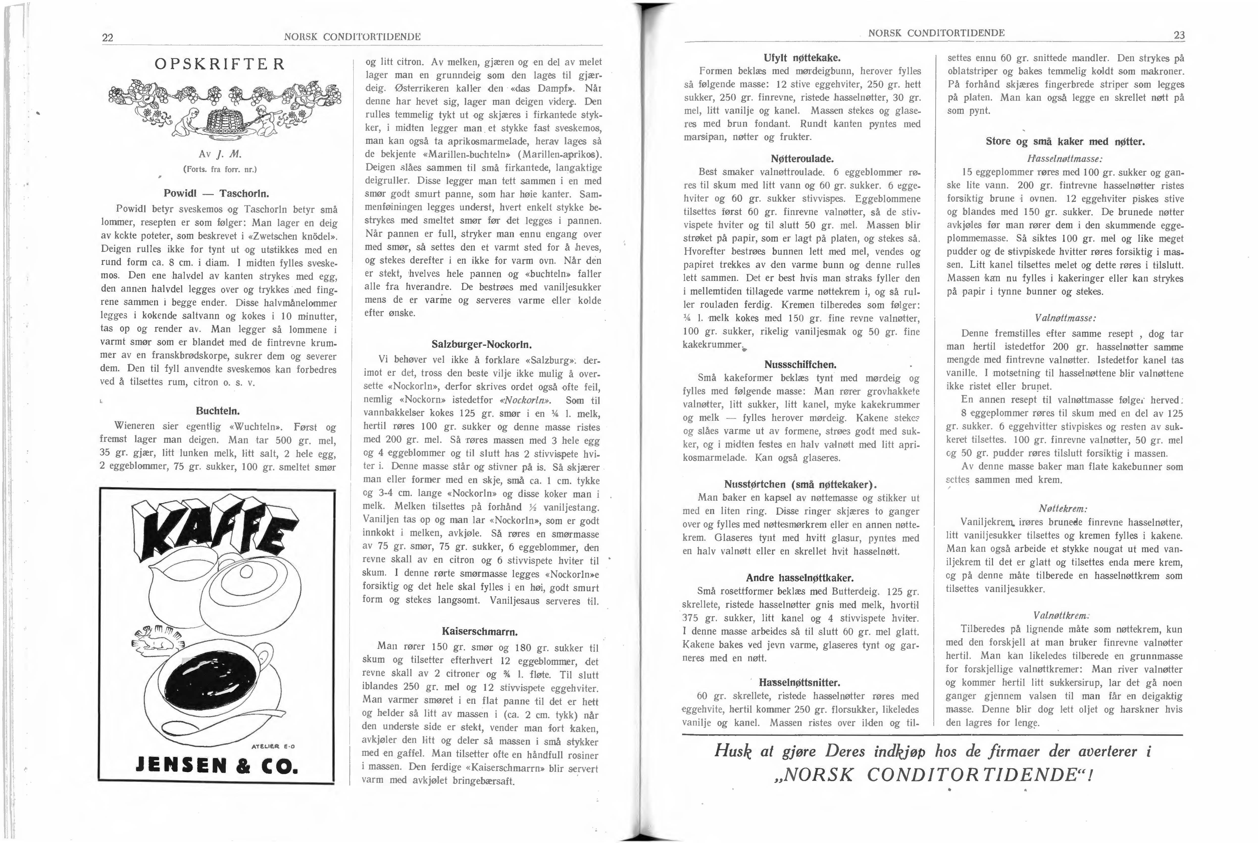 Vi behøver vel ikke å forklare «Salzburg»: derimot er det, tross den beste vilje ikke mulig å oversette «Nockorln», derfor skrives ordet også ofte feil, nemlig «Nockorn» istedetfor «Nockorln» Som til vannbakkelser kokes 125 gr. smør i en ¼ I. melk, hertil røres 100 gr. sukker og denne masse ristes med 200 gr. mel. Så rnres massen med 3 hele egg og 4 eggeblommer og til slutt has 2 stivvispete hvit er i. Denne masse står og stivner på is. Så skjærer man eller former med en skje, små ca. 1 cm. tykke og 3-4 cm. lange «Nockorln» og disse koker man i melk Melken tilsettes på forhånd ½ vaniljestang. Vaniljen tas op og man lar «Nockorln», som er godt innkokt i melken, avkjøle. Så røres en smørmass,e av 75 gr. smør, 75 gr. sukker, 6 eggeblommer, den revne skall av en citron og 6 stivvisp-ete hviter til • skum. I denne rørte smørmasse legges «Nockorln»e forsiktig og det hele skal fylles i en høi, godt smurt form og stekes langsomt. Vaniljesaus serveres Hl.