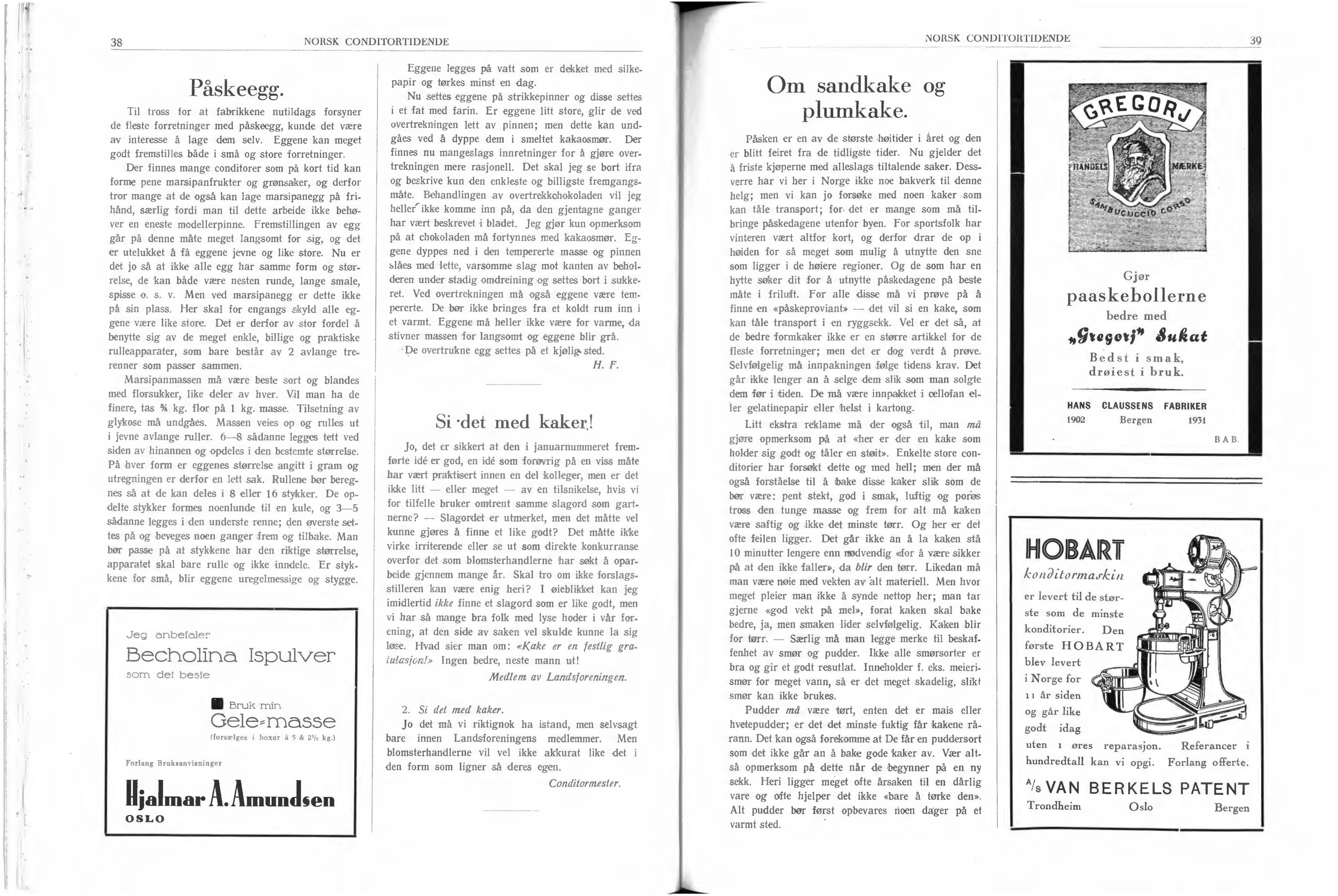 H'jalmar A. Amundsen har atter bragt en nyj1et som sikkert vil finne stor utbredelse i baker og conditorkrdse. Det gjelder en gelemasse med ganske enestående egenskaper. Den moderne videnskap har i den senere tid beskjeftiget sig med geleringsprosesser og deres årsaker, og man har av frukt kunnet utvinne og konsentrere de geledannende stoffer. Gelemassen er ,eit sådant produkt. Utvunnet av frukt som det er, har det i sig selv en behagelig aroma, men det kan tilsettes smakstoffer og man kan efter behag få drn herligste skjære- eller sprøitegele. Massen er flytende, men blir til gele på få minutter ved tilsetning av små mengder fruktsyrer, som også fåes ferdiglavede.