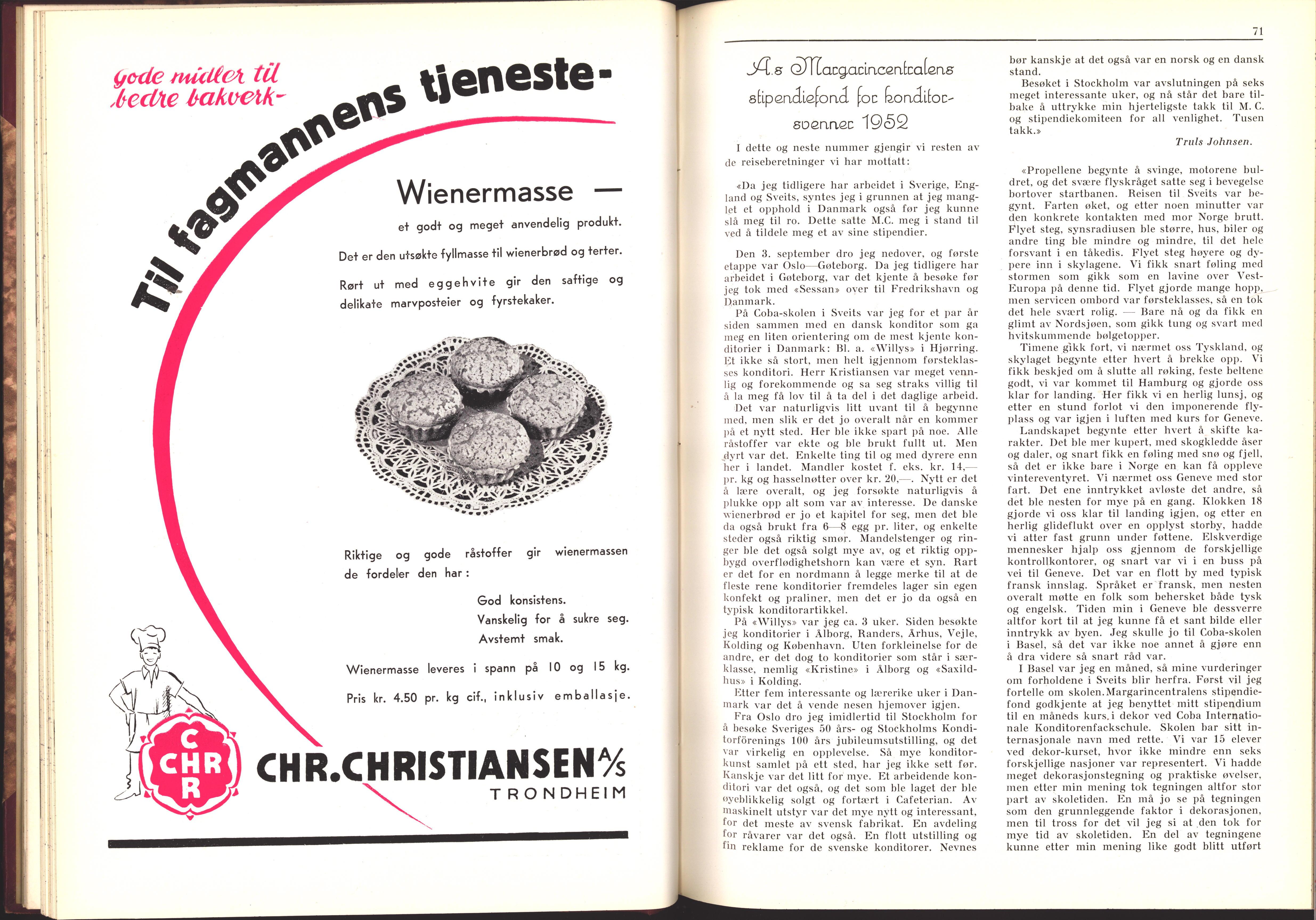 Pfl Coba-skolen i Sveits var jeg for et par Ar siden sammen rned en dansk konditor som ga rnc€{ en liten orientering om de rncst kjentc konditorier i Danmark: Bl. a. <Willys> i Hjorring. lit ikke sh stort, rnen helt igjennorn forsteklasscs konditori. Herr Kristiansen var me5;et vennlig og forekommende og sa seg straks villig til i la meg fi lov til fl ta del i det daglige arbeid. Det var naturligvis litt uvant til i begynne rned, men slik er det jo overalt nfrr en kommer p[ et nytt sted. Hcr ble ikke spart pfl noe. Alle rflstoffer var ekte og ble bruht fullt ut. tr{en !5,rt var det. Enkelte ting til og med dyrere enn her i landet. Mandler kostet f. eks. kr. 14,1rr. kg og hasselnotter over kr. 20,-. Nytt er det i lare overalt, og jeg f orsokte naturligvis e pluhke opp alt som var av interesse. De danske rvienerbrod er jo et kapitel for seg, men det ble da ogsA brukt fra 6-8 egg pr. liter, og enkelte stcder ogsfl riktig smor. Mandelstenger og ringer ble det ogsA solgt mye av, og et riktig oppbygd overflodighetshorn kan varre et syn. Rart er det for en nordmann fl legge merke til at de fleste rene konditorier fremdeles lager sin egen lionfekt og praliner, men det er jo da ogsfi en typisk konditorartikkel.