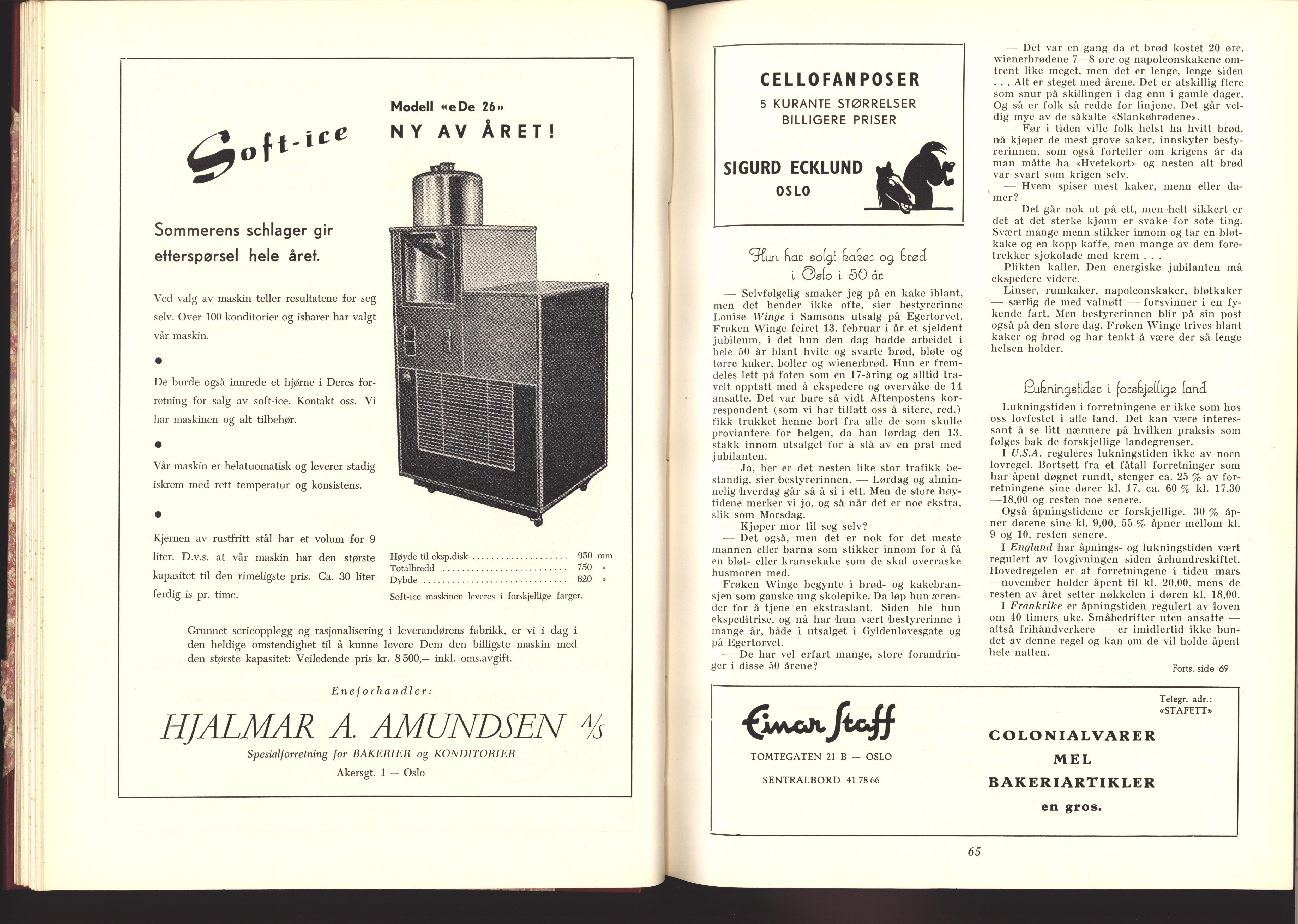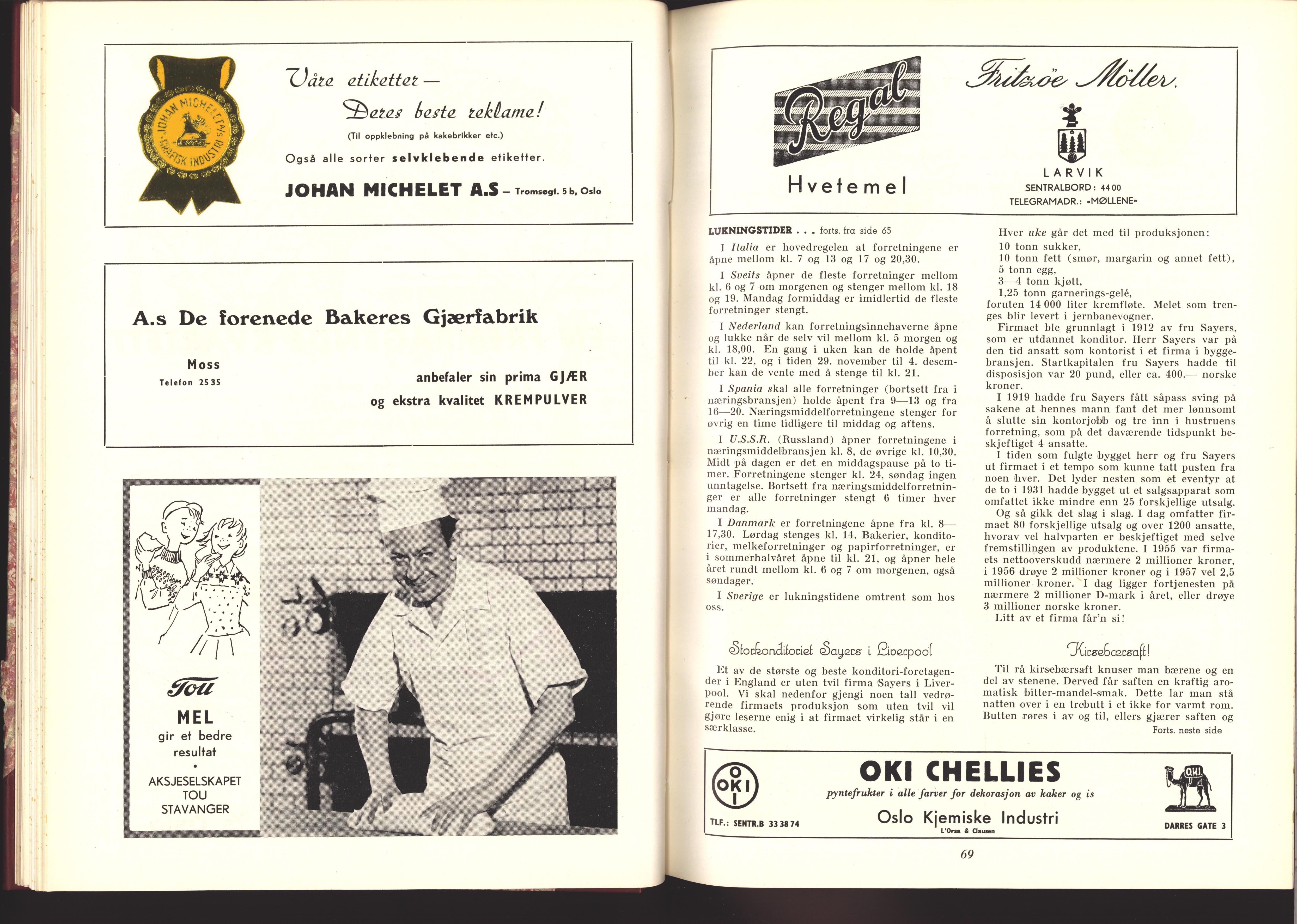 Hver ulce gflr det med til produksjonen: 10 tonn sukker, 10 tonn fett (smor, margarin og annet fett), 5 tonn egg, 3-4 tonn kjott, 1,25 tonn garnerings-gel6, foruten 14 000 liter hremflote. Melet som trenges blir levert i jernbanevogner. Firmaet ble grunnlagt i 1912 av fru Sayers, som er utdannet konditor. Herr Sayers var p6r den tid ansatt som kontorist i et firma i byggebransjen. Startkapitalen fru Sayers hadde til disposisjon var 20 pund, eller ca. 400.- norske kroner.
