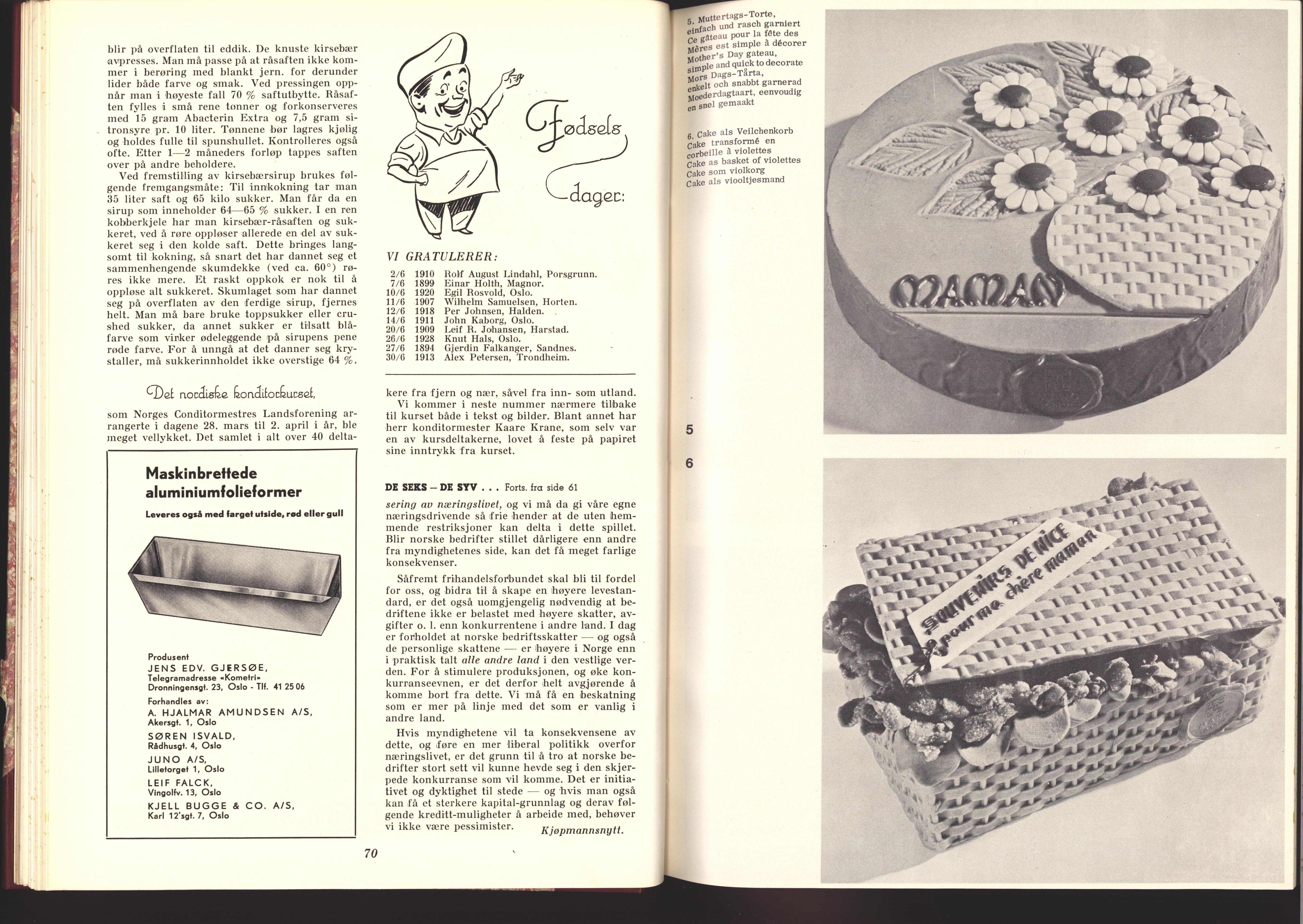 kere fra fjern og nrer, s6Lvel fra inn- sorn utland. Vi kommer i neste nummer nrermere tilbake til kurset bAde i tekst og bilder. Blant annet har herr konditormester Kaare Krane, som selv var en av kursdeltakerne, lovet 6 feste pfl papiret sine inntrykk fra kurset.