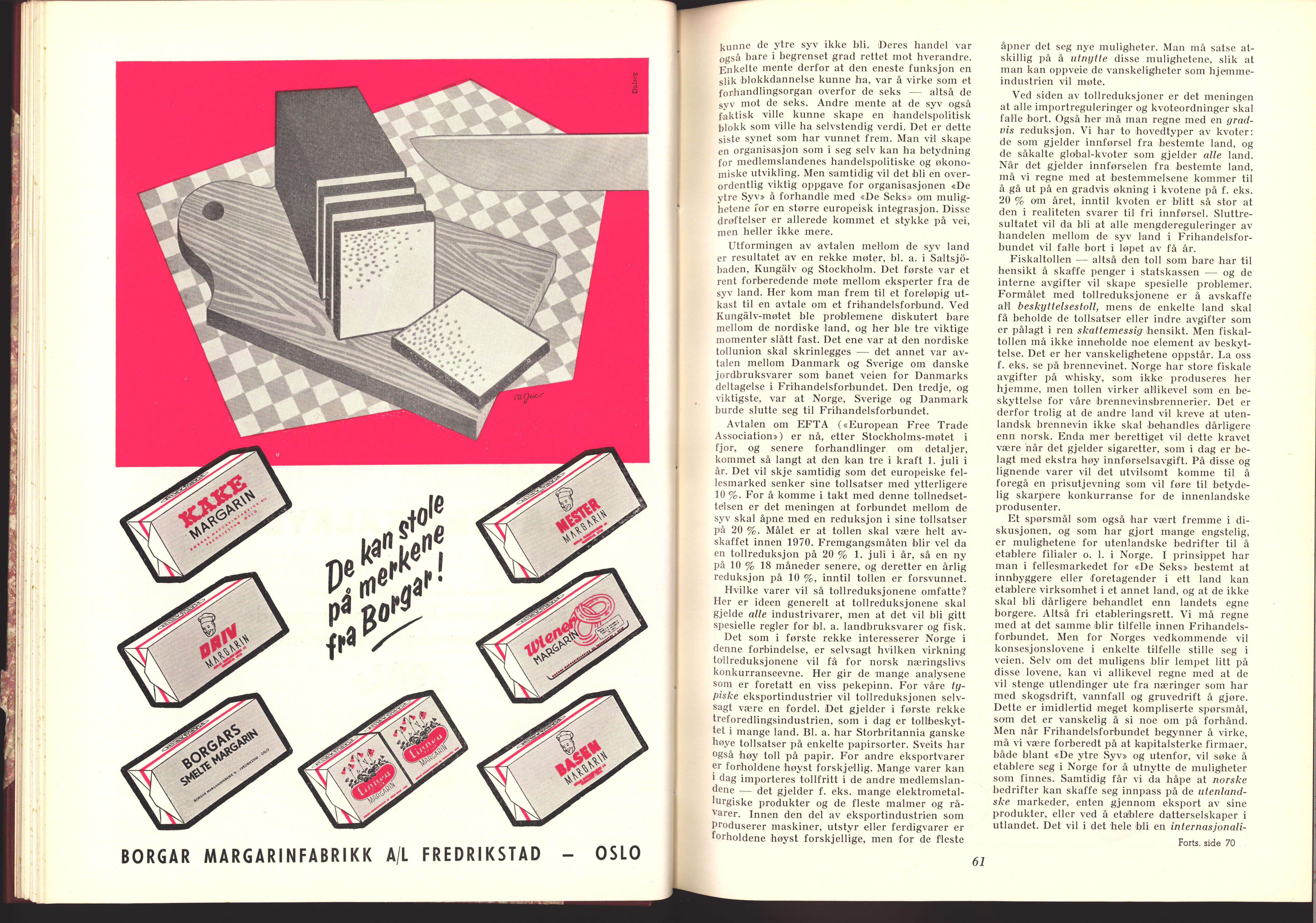Avtalen om EFTA (<European Free Trade Association>) er n6r, etter Stockholms-motet i fjor, og senere forhandlinger om detaljer, kommet si Iangt at den kan tre i kraft 1. juli i fir. Det vil skje samtidig som det europeiske fellesmarked senker sine tollsatser med ytterligere 10 %. For f, komme i takt med denne tollnedsettdlsen er det meningen at for.bundet mellom de syv skal Apne med en reduksjon i sine tollsatser pfl 20 /p. Miiet er at tollen skal vrere helt avskaffet innen 1970. Fremgangsmflten blir vel da en tollreduksjon pA 20 % l. juli i flr, sfl en ny ph l0 % 18 mAneder senere, og deretter en &rlig reduksjon pfi 10 %, inntil tollen er forsvunnet. Hvilke varer vil sfr tollreduksjonene omfatte? Her er ideen generelt at tollreduksjonene skal gjelde a//e industrivarer, men at det vil bli gitt spesielle regler for bl. a. landbruksvarer og fisk. Det som i forste rekke interesserer Norge i denne forbindelse, er selvsagt hvilken virkning tollreduksjonene vil fi for norsk nreringslivs konkur.ranseevne. Her gir de ,mange analysene soln er foretatt en viss pekepinn. For vire fy- pis/te eksportindustrier vil tollreduksjonen selvsagt vere en fordel. Det gjelder i fsrste rekke treforedlingsindustrien, sorn i dag er tolltreskyt- tet i mange land. Bl. a. har Storbritannia ganjke noye tollsatser pi enkelte papirsorter. Sveits har ogsi hoy toll pi papir. For andre eksportvarer er forholdene hoyst forskjetlig. Mange varer kan t dag importeres tollfritt i de andre medlemslandenedet gjelder f. eks. mange elektrometalturgiske produkter og de fleste malmer og rivarer. Innen den del av eksportindustrien som produserer maskiner, utstyr ell,er ferdigvarer er forholdene hoyst forskjellige, men for"de fleste