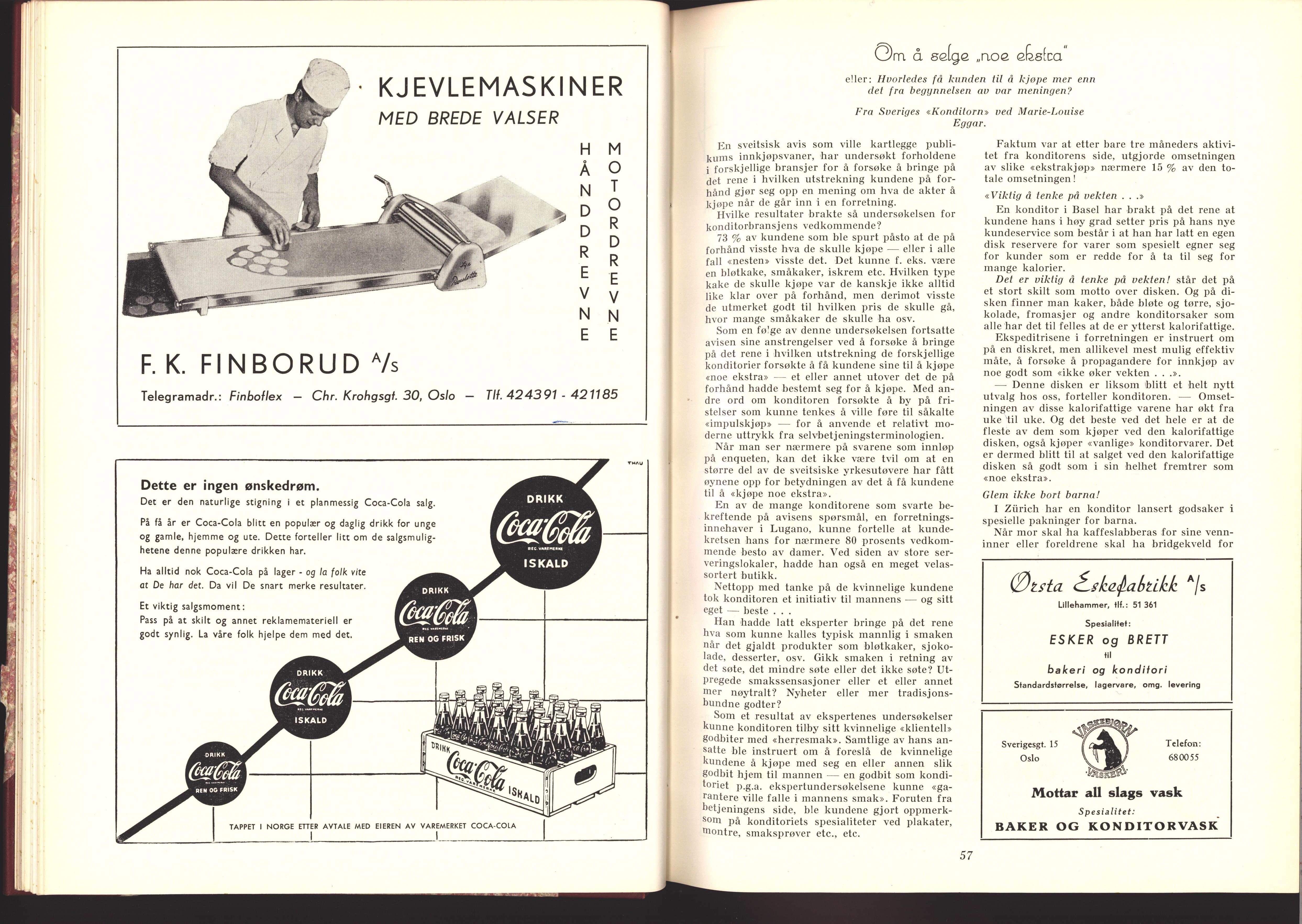 Som et resultat av ekspertenes undersskelser kunne konditoren tilby sitt kvinnelige <klientell>> god,biter med <herresmak>. Samtlige av hans ansatte ble instrueri om fl foresli te kvinnelige kundene A kjope med seg en eller annen slik godbit hjem til mannenen godbit som kondi- toriet p.g.a. ekspertundersskelsene kunne <ga- rantere ville falle i mannens smak>. Foruten fra betjeningens side, ble kundene gjort oppmerksom pe konditoriets spesialiteter ved plakater, rnontre, smaksprover etc., etc.