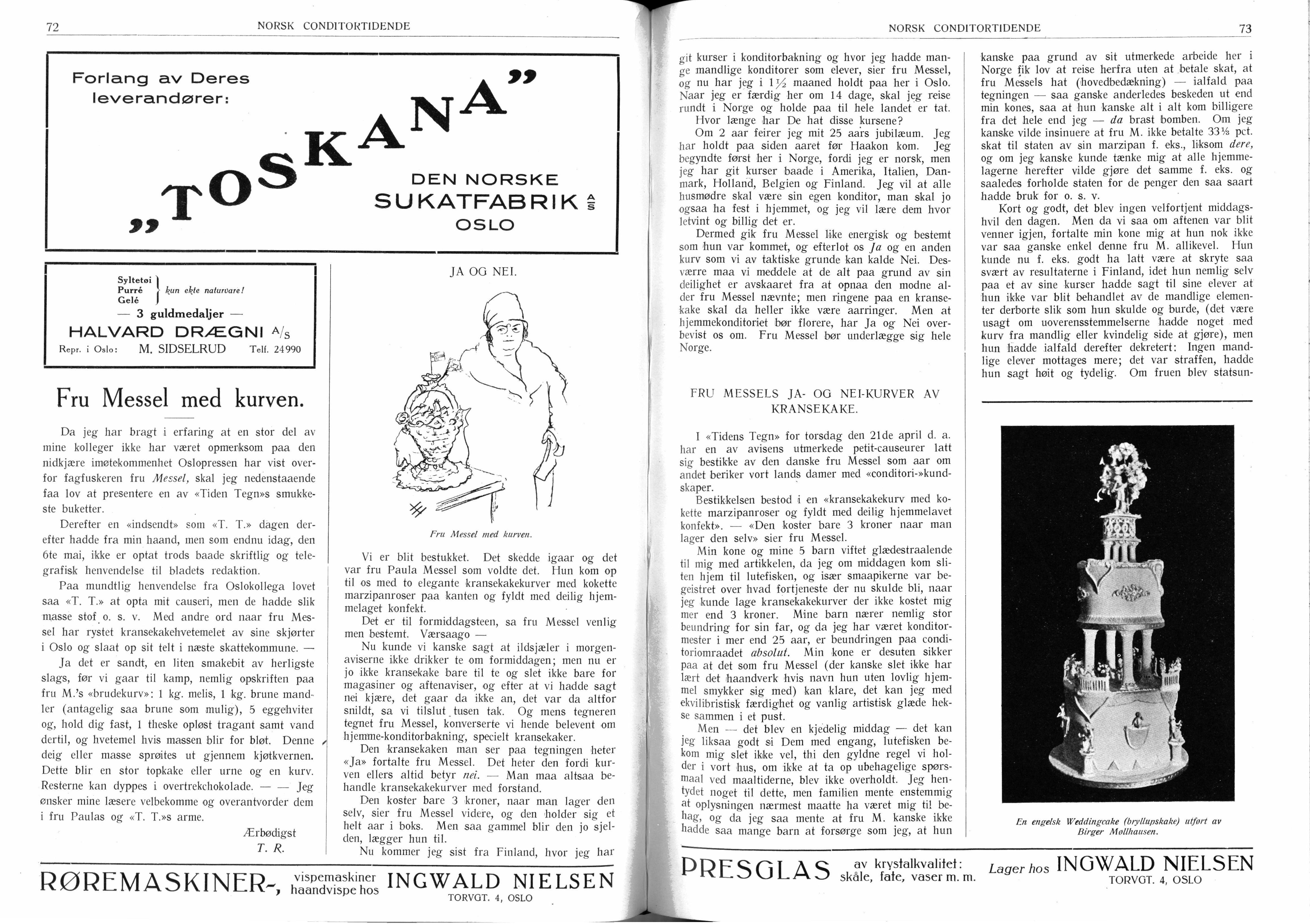 nv. da clet er visse hensyn sofil maa tages, dog er ii,i ntit litt bedre i det siste aar. lfien, hadde pro' iestykket vreret litt vanskeligere, saa tror jeg ikke saa'svart mange var saa ivrige til at iorsoke det, lsr de folte sig sikre i arbeidet, og lettere blev det ior navnden. De fleste tror at kan han lave butierdeig og en blot kake, ja vel' saa er han conditor' For at saa mange svender ikke er saa dyktige som de burde vare, lrcgger jeg mest skylden paa arbeids' tiden, for det er jo for det meste om eltermiddagen og aftenen det finere arbeide foregaar, og da er jo biade svender og gutten forsvundet og det blir da mcsteren som faar gjore det, og det larer jo ikke gutten noget av. Jeg skal ta et eksempel: En bestilling paa en kurv med karamellerte frukter, en iskake med sp,undet sukker. Dette er jo ikke heldig at lave om formiddagen, naar det skal brukes om aftenen, det vet vi jo alle. Det kan la sig gjore, men det blir ikke som det skal vare. Alle, eller de fleste av os som driver conditori har nok arbeide med det nodvendige som hver dag skal til i butikken, og jeg forstaar ikke naar gutten skal tilegne sig de kundskaper der f,ordres av en svend som skal arbeide selvstandig. Det er jo saa at man larer som svend, men man maa ha et grundlag, saa gaar det lettere. En nyutlart svend, som kommer til utlandet i vore dage, faar det ikke godt, isar i den forste tid. Der lordrx adskillig mere baade av kundskaper og tempo. Vi maa jo indromme at vi staar tilbake for utlandet, isrr hvad tempoet angaar, men vi faar vere enige om at gjore al't vi kan for at gutten kan bli en dyktig svend. Det er forresten vor plikt, men gutten maa ogsaa lagge godviljen til, hvis mesteren skal vise interesse for at gutten skal bli en dyktig svend.