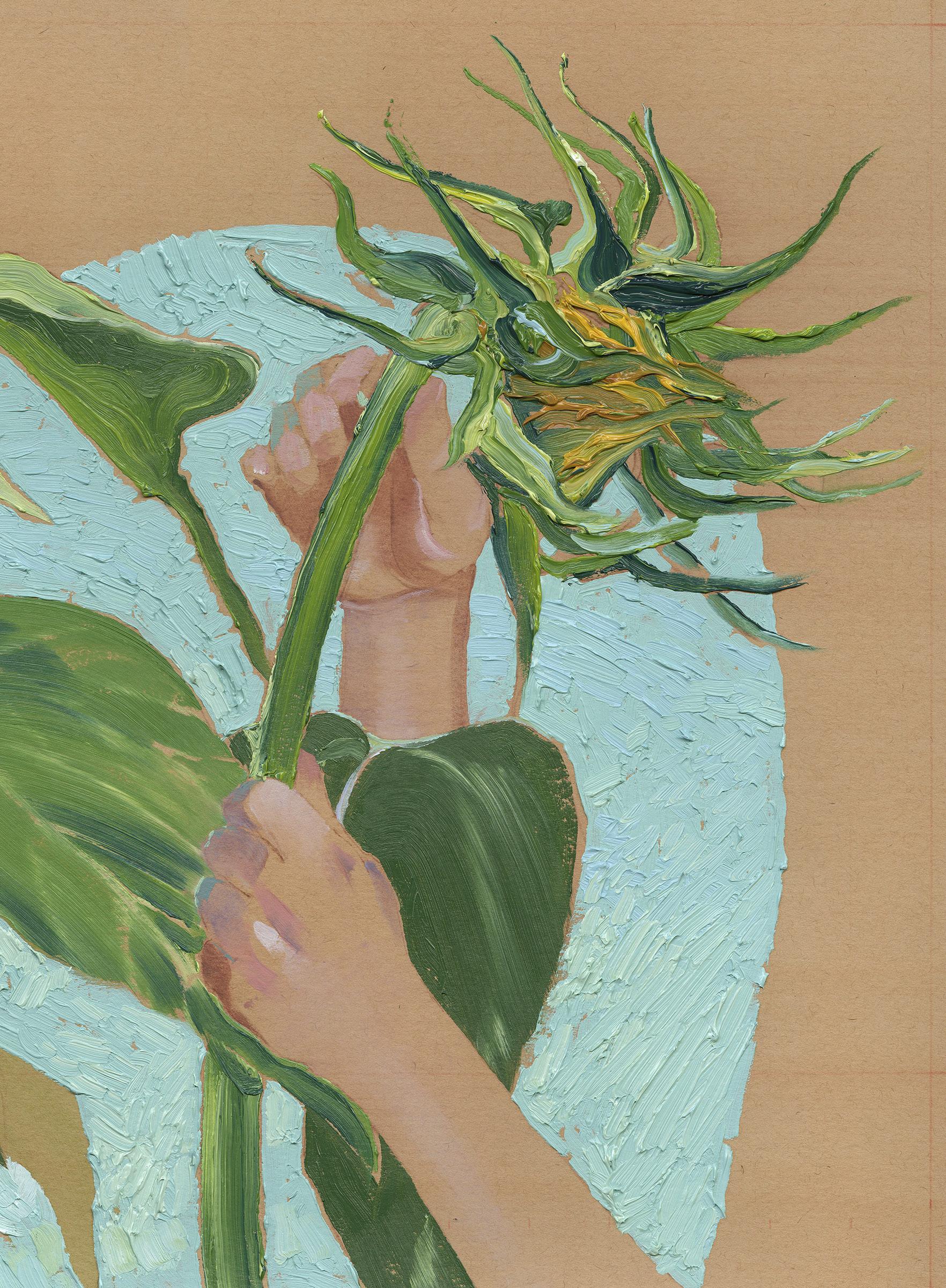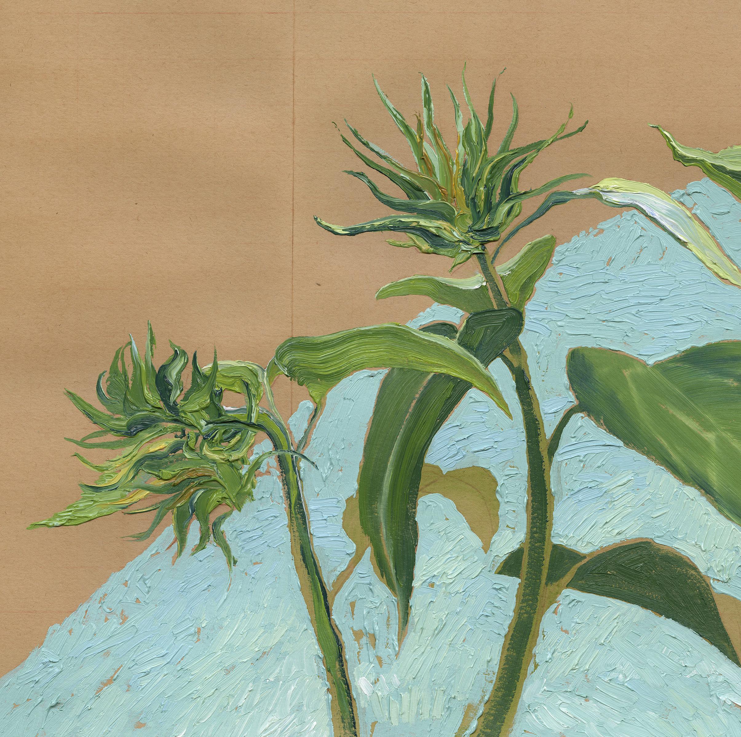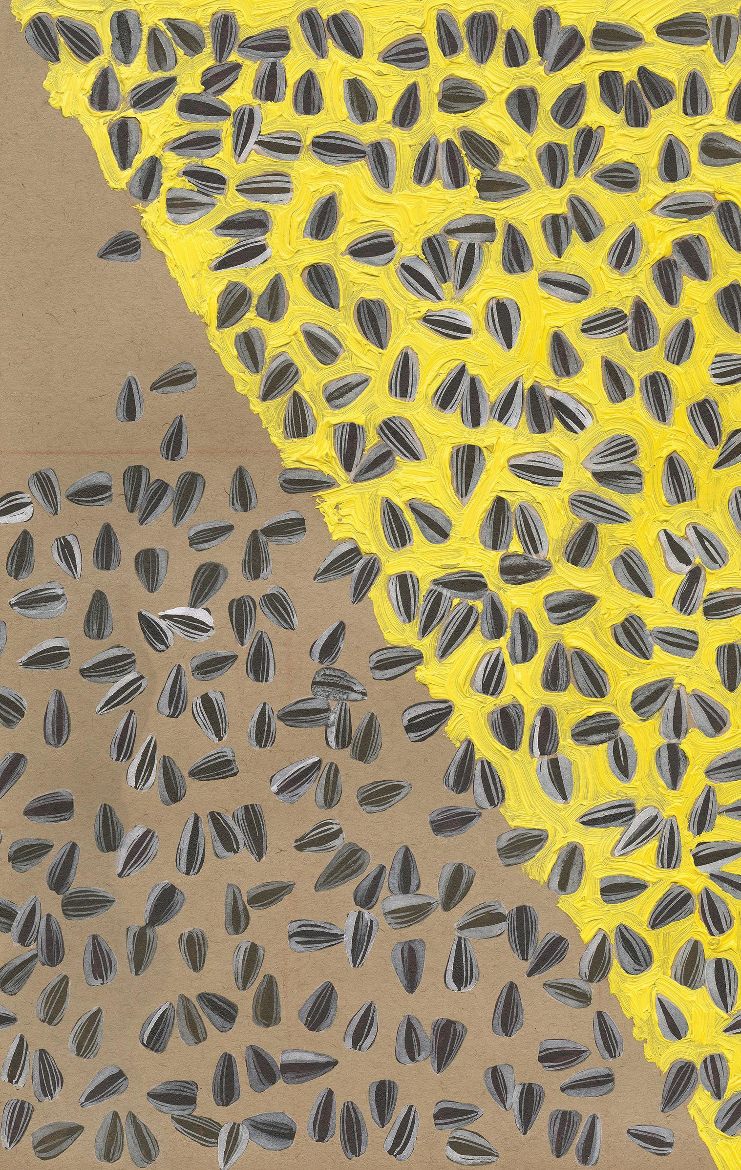 While making Sunflower Seeds, Heck looked to artists from the past who had painted with Oil on paper and also painted sunflowers. She considered the way numbers and math can be hidden in structures, how brushstrokes add meaning to composition, and how both positive and negative space affect the arrangement of a picture.