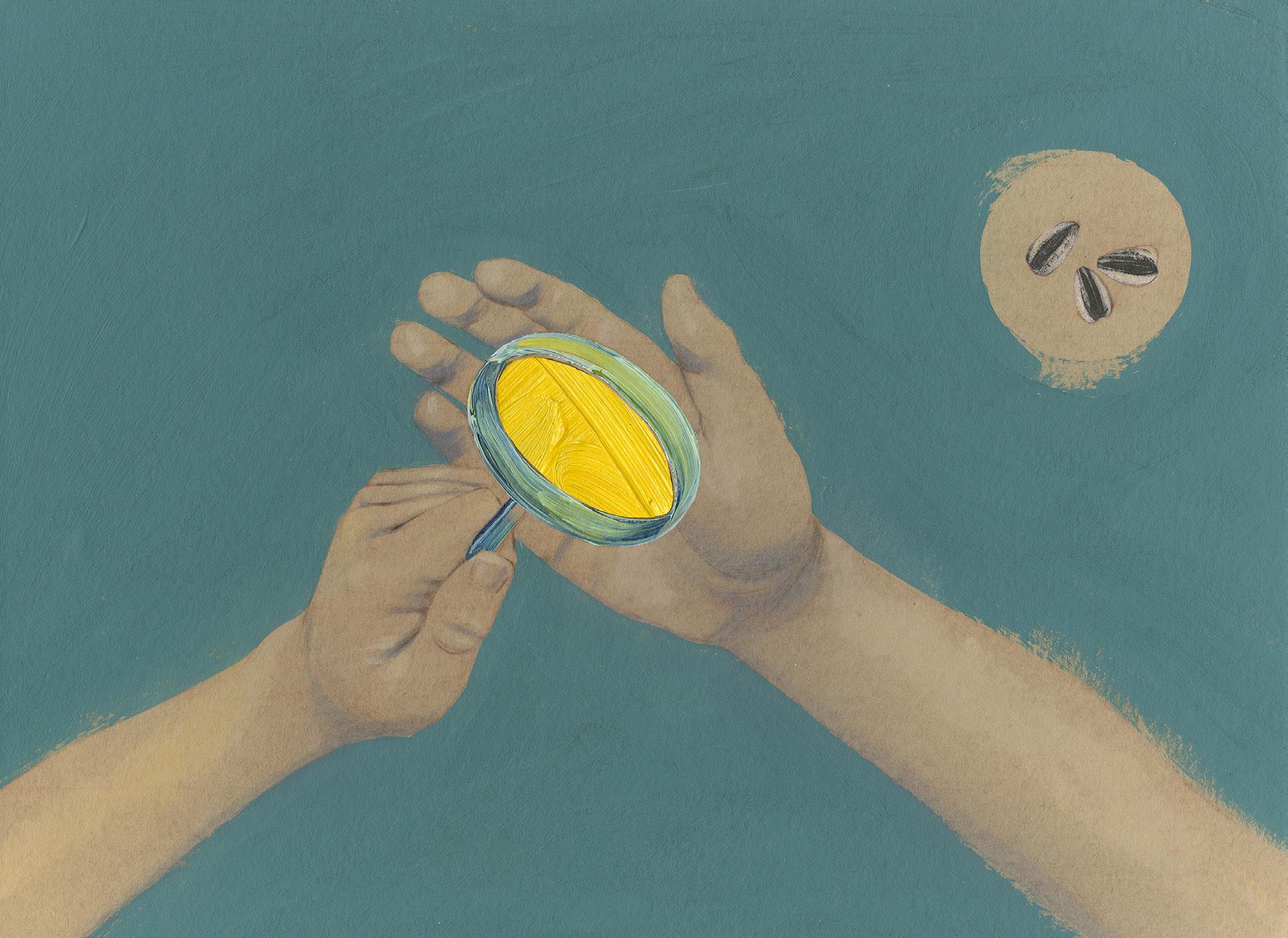 Cupped Hands Holding Sprout, 2025 Oil on paper mounted on panel