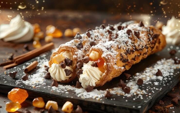 Cannoli: Cannoli are crisp, tube-shaped shells filled with a sweet, creamy filling often made from ricotta cheese. They can be garnished with chocolate chips, candied fruit,orpistachios.