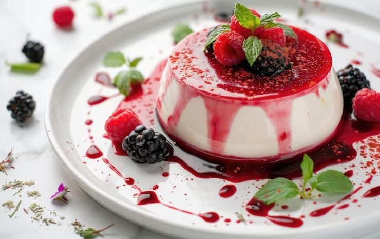 Panna cotta, meaning “cooked cream,” is a creamy, gelatin-based dessert that is usually served with a berry compote or caramel sauce. The texture is silky, and it’s typically molded into a delicate shape.
