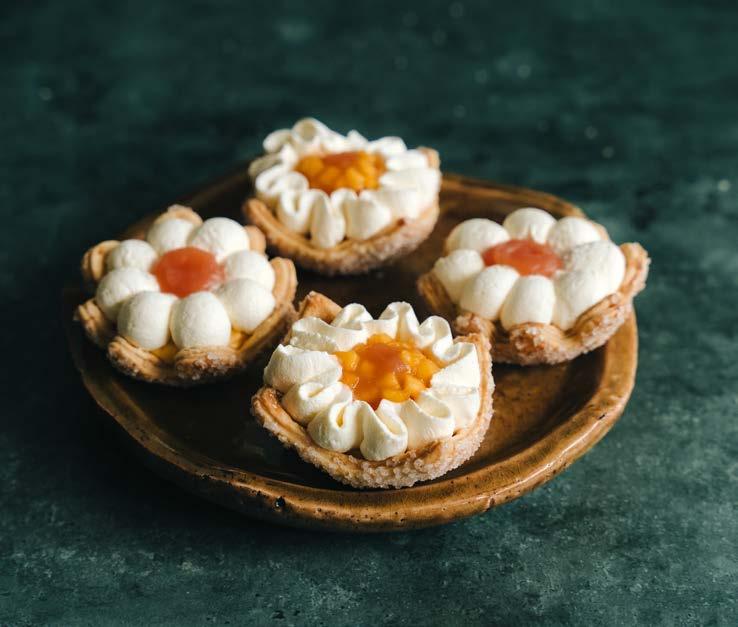 Deze bloemvormige gebakjes zijn niet alleen een lust voor het oog, maar ook een verrassend frisse traktatie dankzij de tropische combinatie van mango en grapefruit.