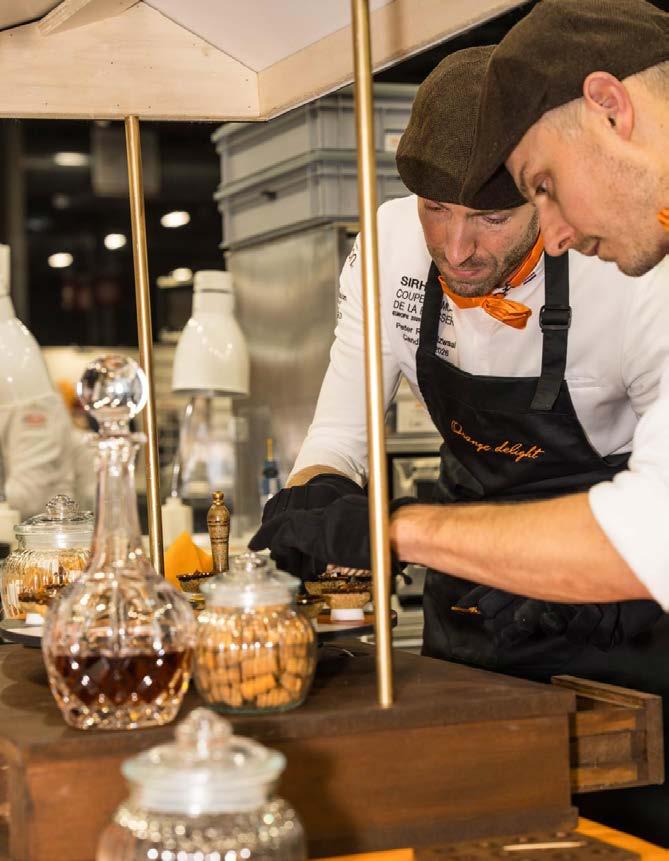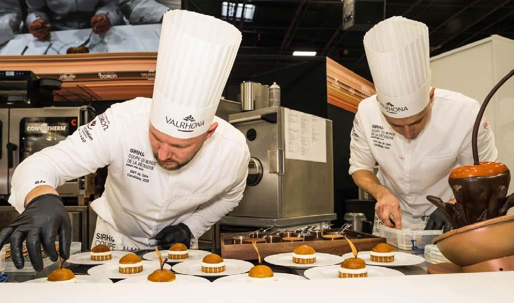 ken, texturen, contrasten en gelaagdheid. Een crispy chocolade cup met de perfecte krak, gevuld met chocoladecake en daarop een romige chocoladecrème. ‘Voor een extra crunch en subtiel zout contrast hebben we er een bacon crumble in verwerkt. Plus een royale touch van whiskey. Dan een dekseltje van karamel en 80 procent Equateur chocolade. Met als eyecatcher en verbinder naar het showstuk een toffee van karamel, gianduja en een superkrokant, flinterdun suikerlaagje’, aldus het team.