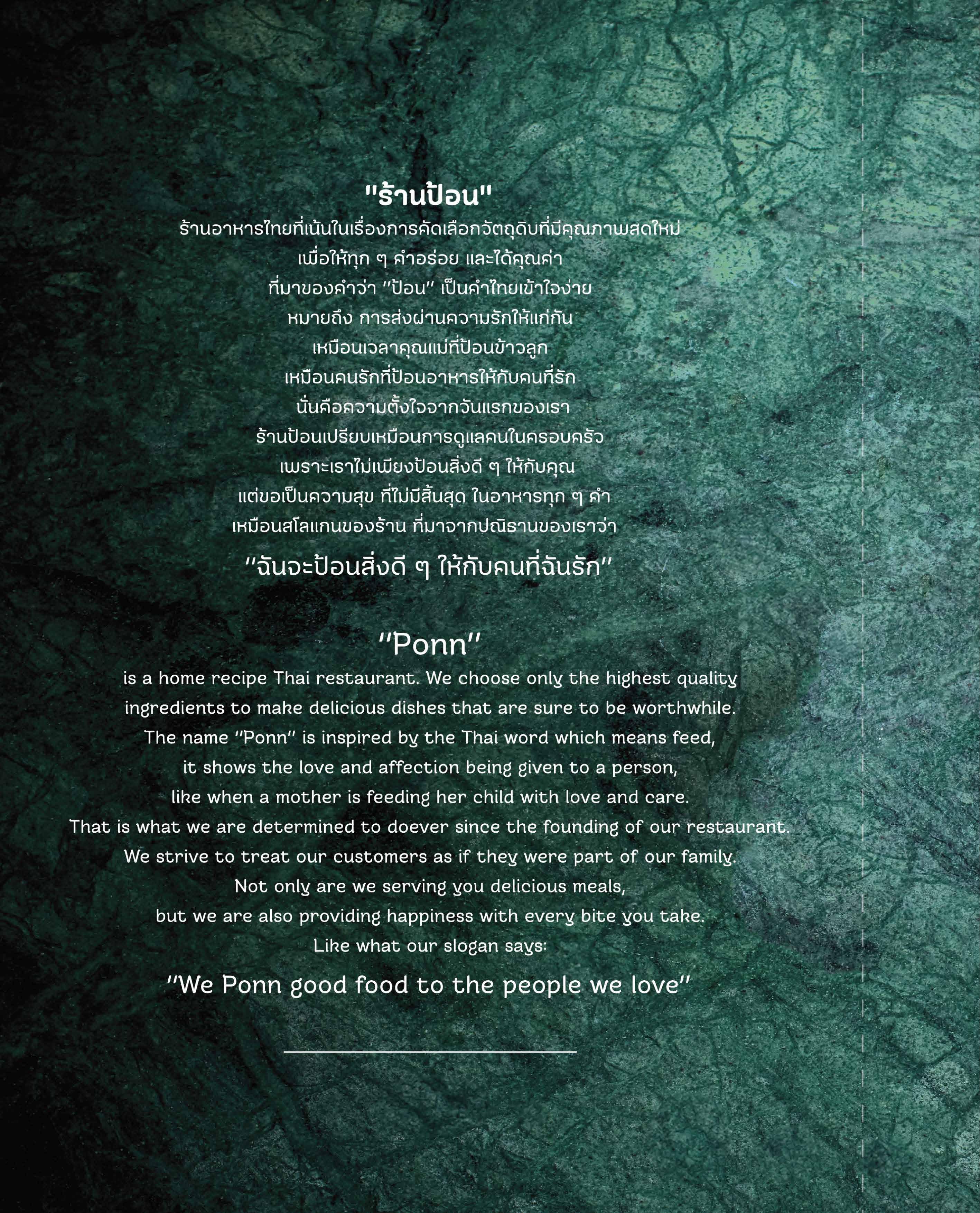 แต่ขอเป็นความสุข ที่ไม่มีสิ้นสุด ในอาหารทุก ๆ คำ เหมือนสโลแกนของร้าน ที่มาจากปณิธานของเราว่า