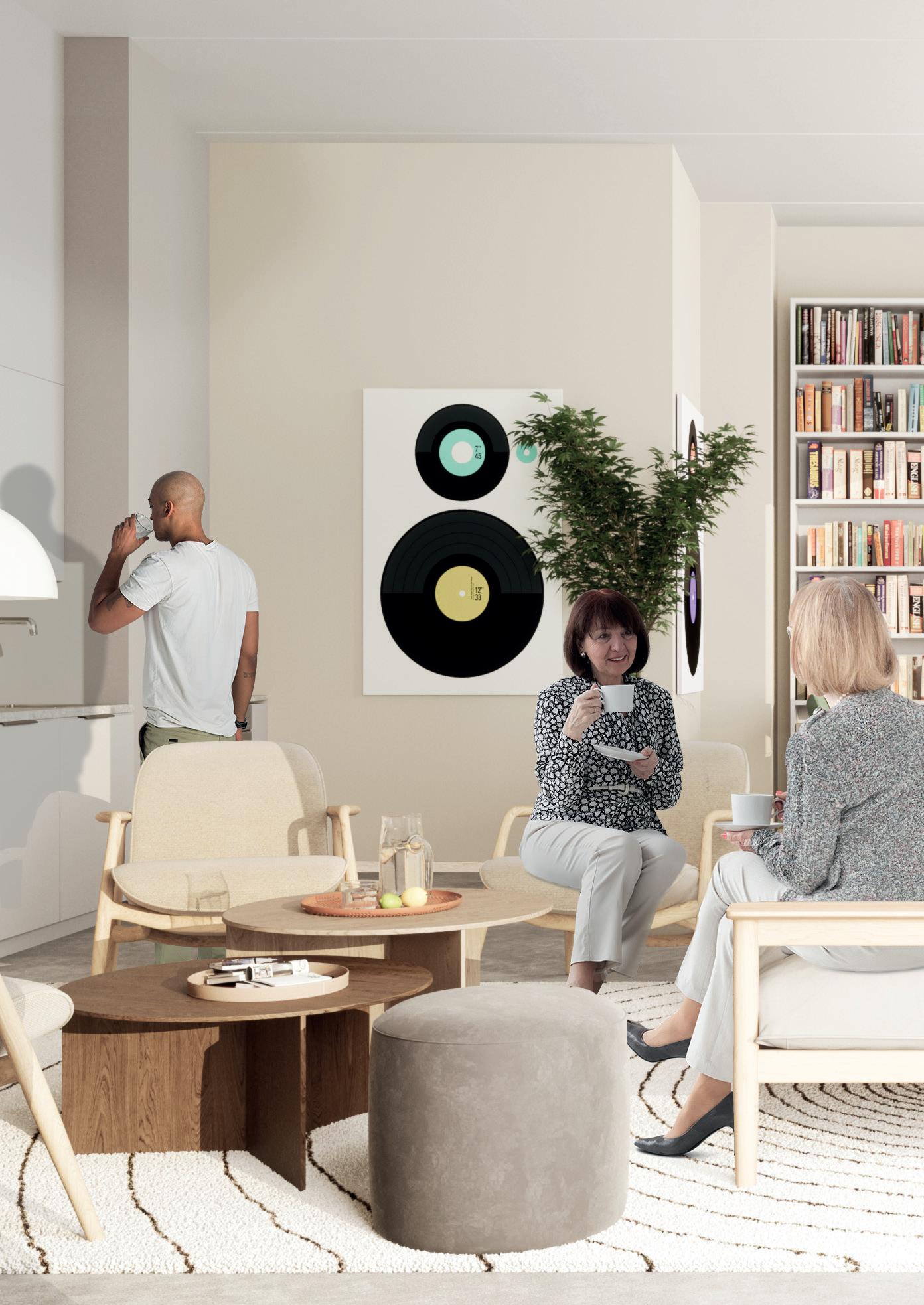 Illustrasjon av fellesstuen. Avvik vil forekomme.