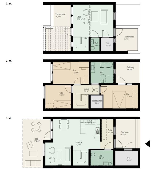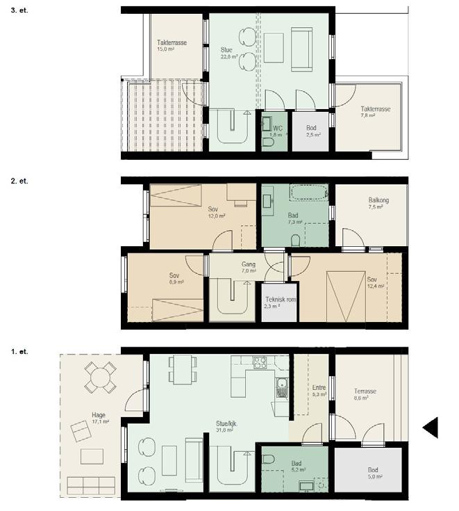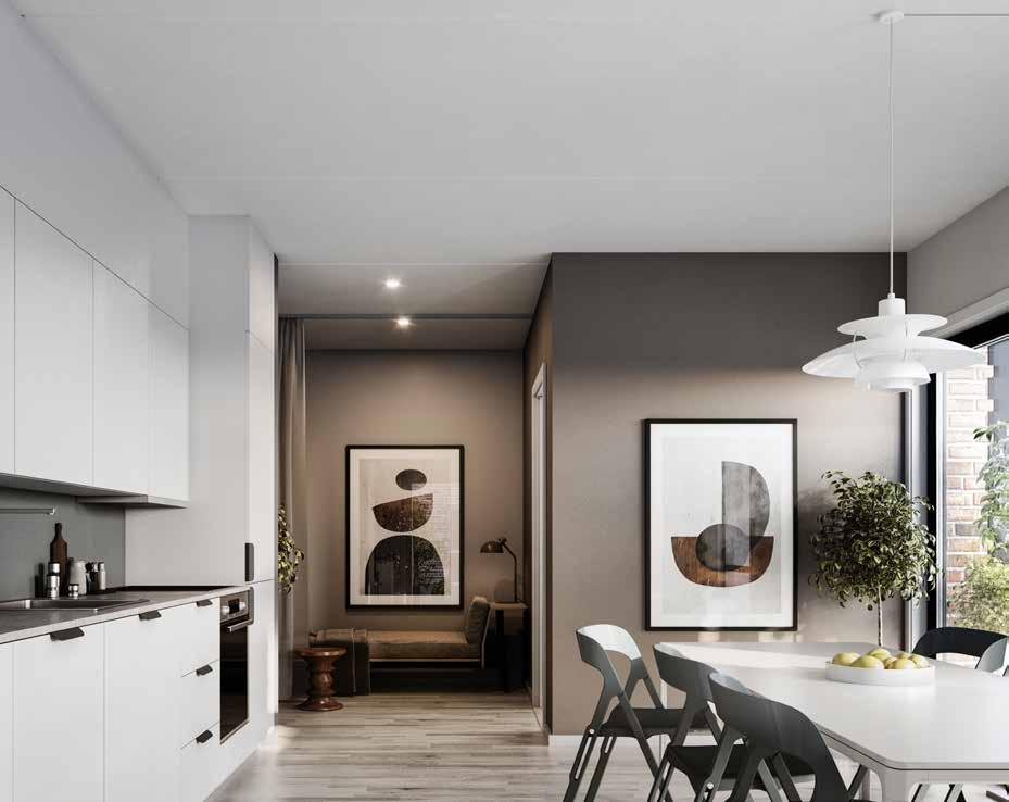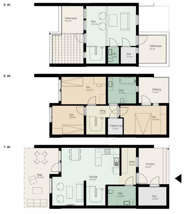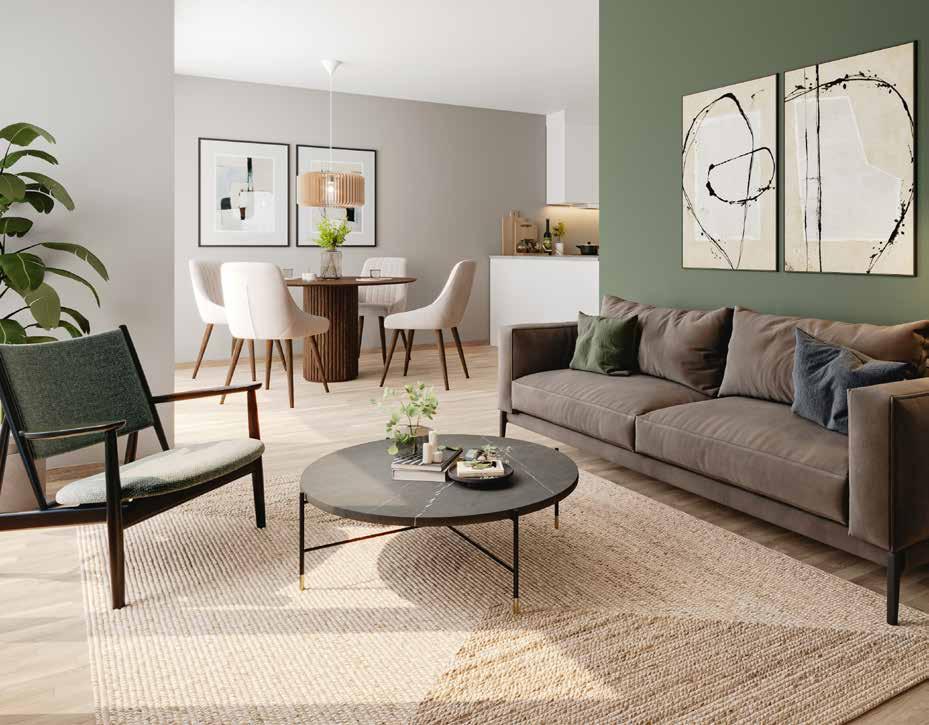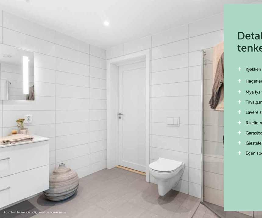 Alle presentasjoner, planer, skisser og bilder i salgsmaterialet er av illustrativ og generell karakter og kan derfor vise bygningsvolumer og inneholde innredning og detaljer mv. som ikke inngår i leveransen eller passer for alle boliger.