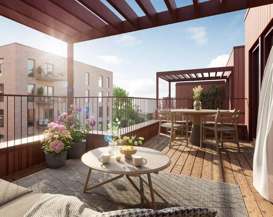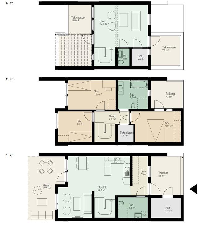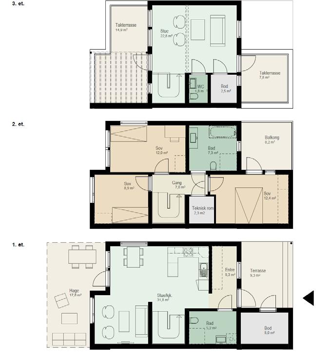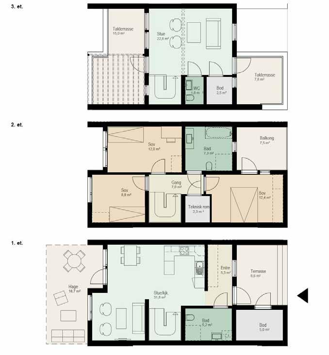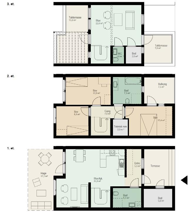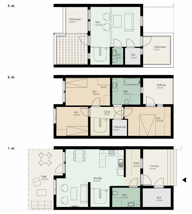 Alle presentasjoner, planer, skisser og bilder i salgsmaterialet er av illustrativ og generell karakter og kan derfor vise bygningsvolumer og inneholde innredning og detaljer mv. som ikke inngår i leveransen eller passer for alle boliger.