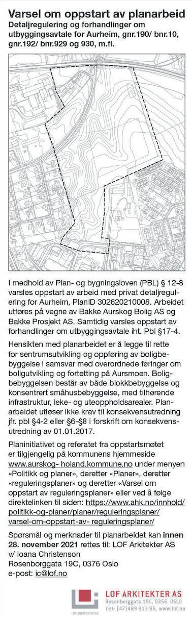 1 Forslag til detaljreguleringsplan for deler av eiendommen Aurheim (Aursfaret 19, gnr.192/bnr.10, 929,930, m.fl.) PLANBESKRIVELSE 04.05.2022 Forslagsstiller: Bakke Aurskog Bolig AS (delområde S5) Bakke Prosjekt AS (øvrige delområder) Plankonsulent: LOF arkitekter AS Fakturamottaker: Bakke Aurskog Bolig AS VEDLEGG