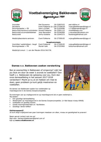 Dames v.v. Bakkeveen zoeken versterking Ben je woonachtig in Bakkeveen of omgeving? Lijkt het jou leuk om door de week ’s avonds te voetballen? Dan heeft v.v. Bakkeveen de oplossing voor jou. Kom dan onze damesafdeling in het seizoen 2017-2018 versterken!! Mocht je nu al zin hebben om mee te doen, geen probleem je kunt gelijk meetrainen en voetballen. De dames van Bakkeveen spelen hun wedstrijden op maandagavond in de Dames Dorpencompetitie. De trainingen zijn op vrijdagavond en op maandagavond als er geen wedstrijd is. Wij bieden: Een gezellige damesafdeling. Wedstrijden op maandagavond in de Dames Dorpencompetitie. (± 4de klasse niveau KNVB) Voetballen en gezellig trainen. Goede trainingsmaterialen en -faciliteiten. Gezellige ‘derde helften’ Geïnteresseerd? Je kunt altijd vrijblijvend een paar trainingen meedoen om sfeer, niveau en gezelligheid te proeven! Neem gerust contact met ons op! Mail naar: damesvvbakkeveen@gmail.com of kijk op www.vvbakkeveen.nl.