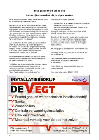 Hoe versterk je je afweersysteem en houd je je spijsvertering in topvorm? • Wat doe je tegen koortsuitslag, oorpijn of bij griep en verkoudheid? Belangrijk onderdeel van deze workshop is het gebruik van gembercompressen. Ontdek zelf dat gezond voedsel ook medicijn kan zijn en leer in deze workshops hoe je jezelf, je familie en vrienden kunt helpen bij lichamelijke ongemakken. Ook hiervan neem je de recepten mee naar huis. We zien je graag op deze leuke en leerzame dag! Ontvangst 10.00 uur, lunch 12.30 uur en 16.00 uur sluiten we af. Deze dag vindt plaats in Mieke’s kruidentuin, Mjumsterwei 41 (ingang Dwarswyk) te Bakkeveen. Prijs € 50,00 per persoon inclusief lunch en cursusmateriaal. Voor meer informatie: 0516-541393