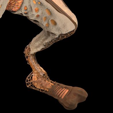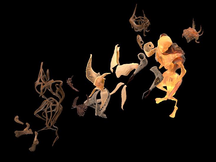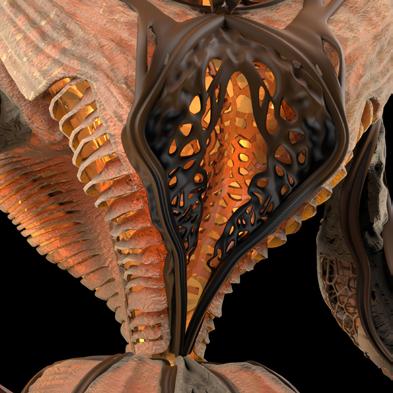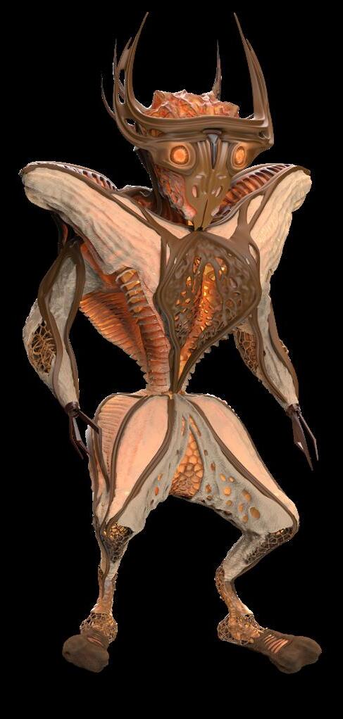 Below An exoskeleton had grown from the spine to protect the internal organs from the heat and dust Right top The feet had dried up and it had mutated into hard, porous surfaces like hooves Right bottom Most of the flesh on the limbs had burned off and disintegrated slowly, leaving many dried fractal bones around their joints