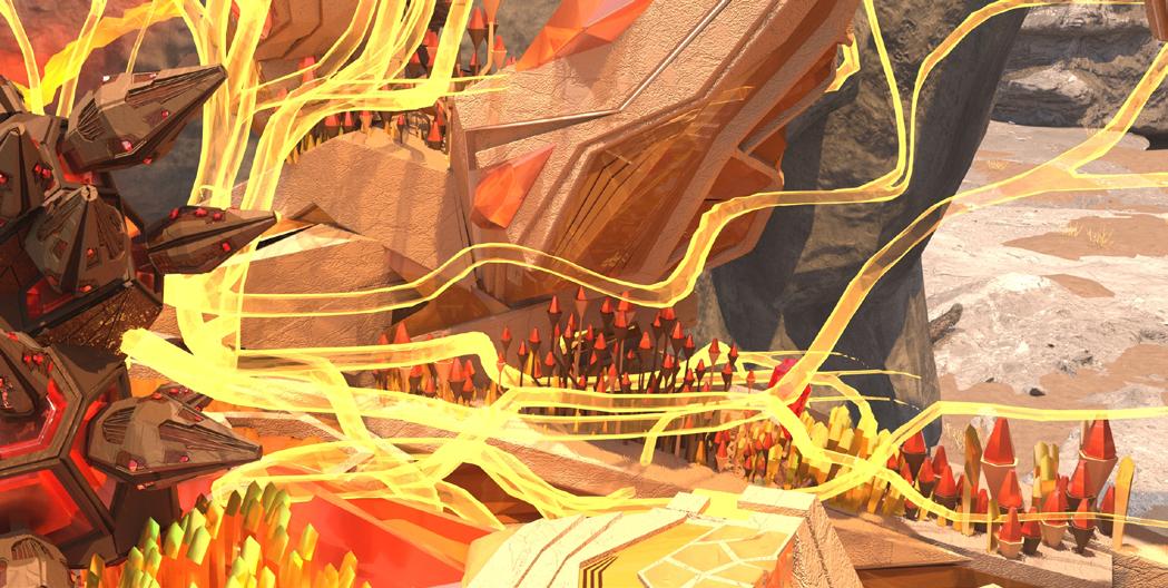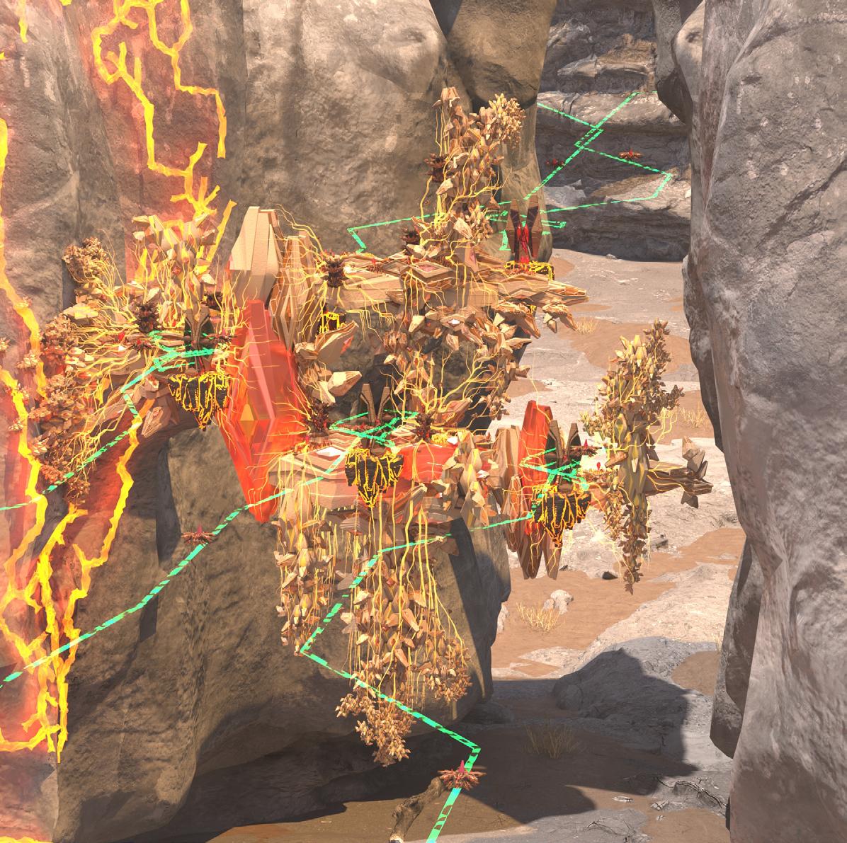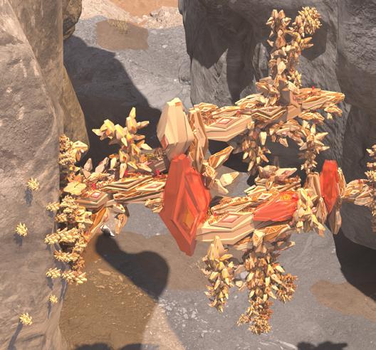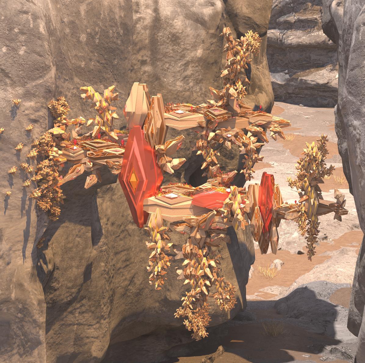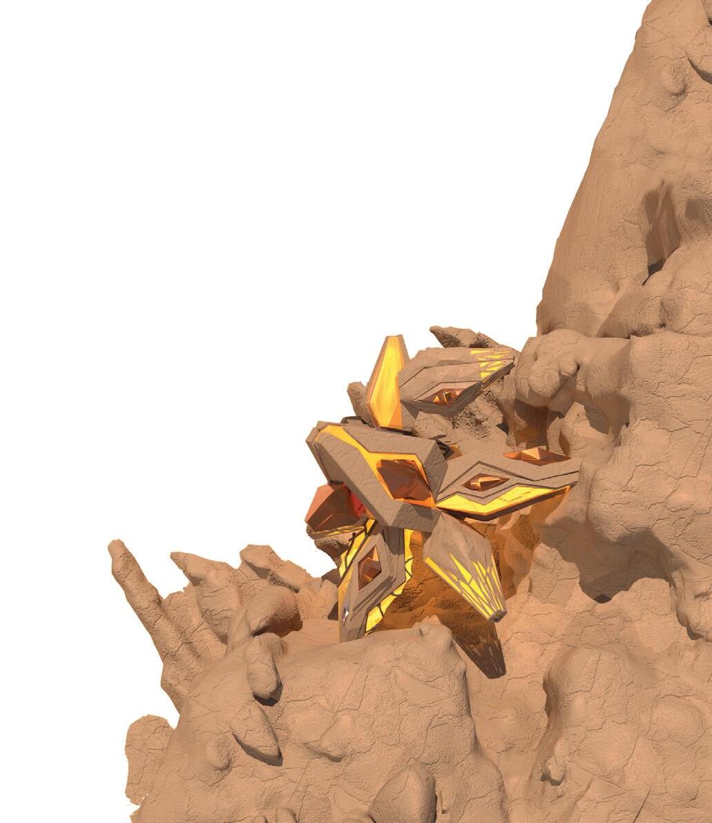 Retardants began to seek new forms of shelter in this radical environment. They started creating burrows made of fragmented rock pieces, pebbles, and mineral gems. Their monolithic havens consist of layered rock panels, translucent dust filters, thermal pebbles, bio-luminous energy crystals, and more. To shelter them from the extreme heat, their colonies are usually nestled in the narrow spaces between canyon-like mountains.