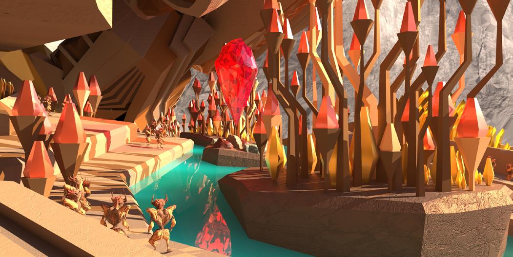 The levitating crystal, located at the heart of this space, is filled with lava that creates a magnetic field around it, holding the different elements of the colony together.