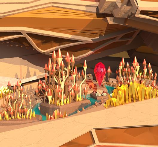 The colony has a series of crystal farms and mineral depots that help harvest energy and grow minerals. A cave-like sheltered space amidst the interstitial spaces between the units acts as the communal hub. It has a series of crystal farms growing within a mineral lake, which is the most fertile part of the colony.