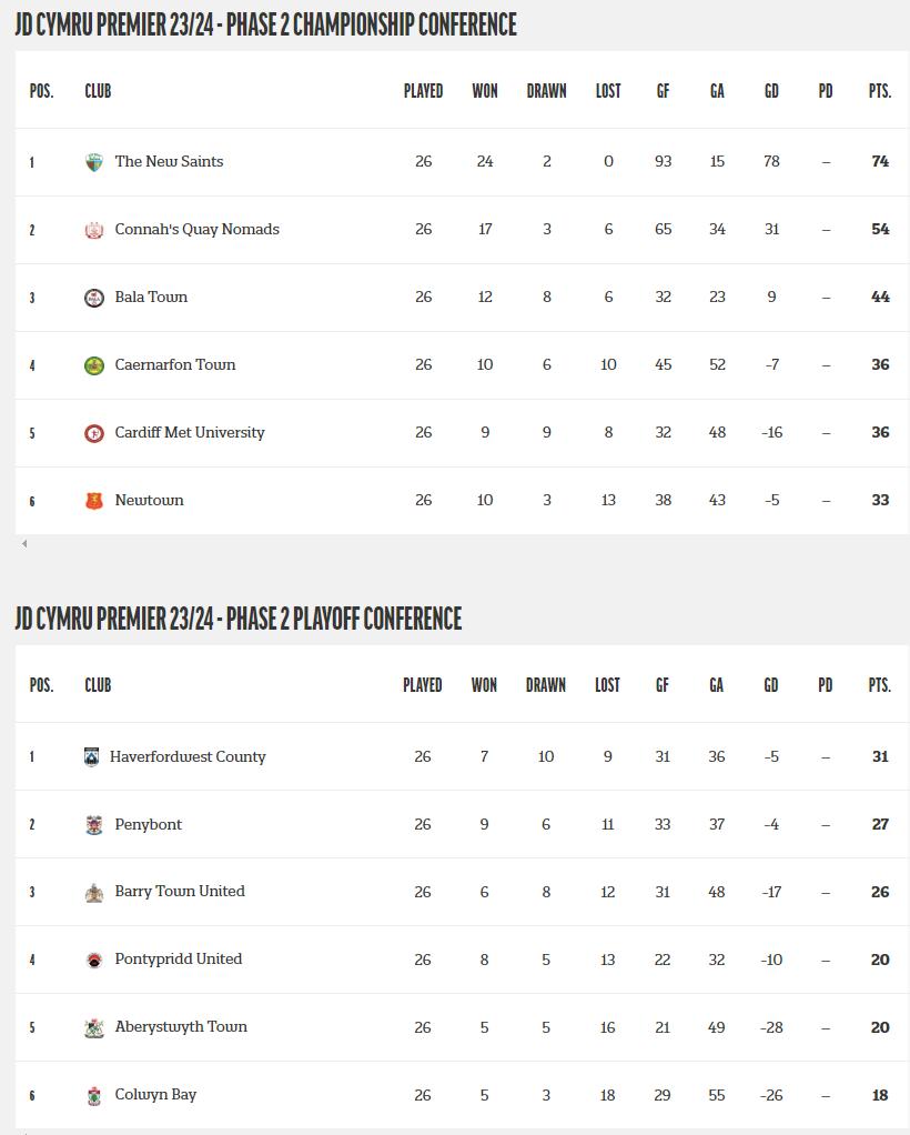 JD CYMRU PREMIER RESULTS