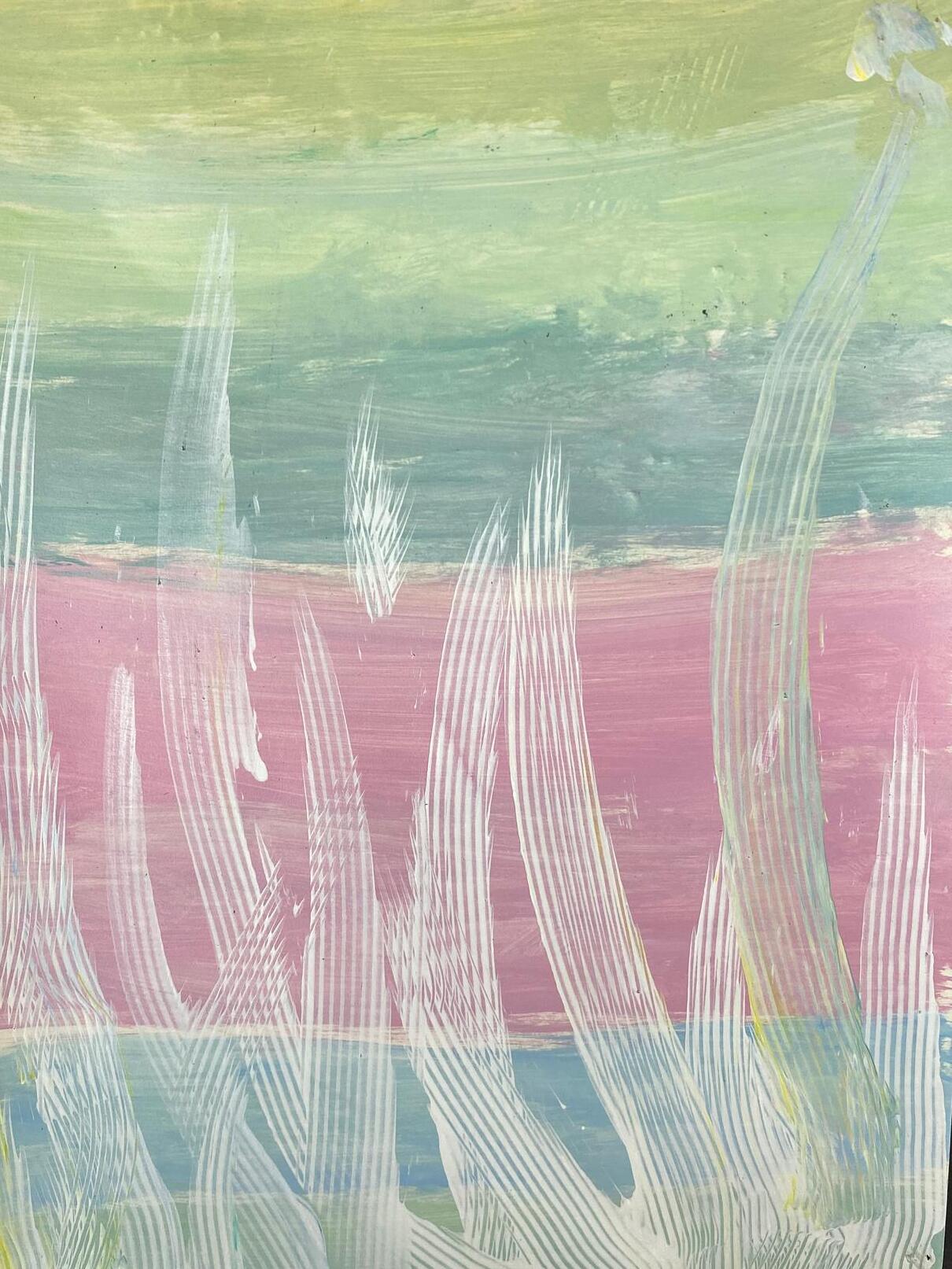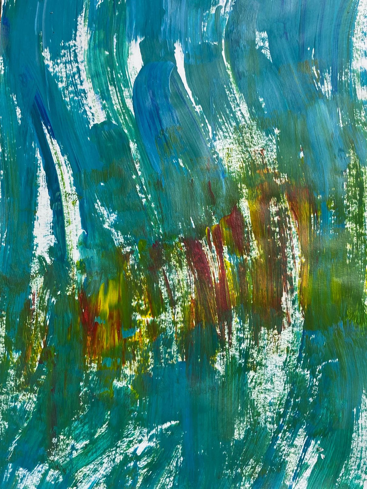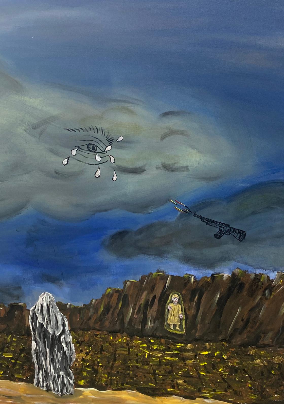 In this creative piece, I am portraying Scene 3 from Act 1 where the three witches are telling Macbeth what his three prophecies entail. This exact scene is the beginning of a long journey down the feelings of dangerous ambition and greed, and even the dark acts of manipulation and murder. Through the usage of colors such as red, black, grey, bronze, green and brown I was able to captivate the tones of this scene which were sinister, dark and, finally, morbid For starters, I began by setting the background, a mixture of grey and white, which symbolizes Macbeth’s already morally grey characteristics which will later on prove to harm his previous “purity” in his overall person Then I moved on and covered the edges of the piece with a material that resembled clouds and thus suggested that the three witches had the power to cloud Macbeth’s judgment with said prophecies. These three prophecies encompassed Macbeth––already being the Thane of Glamis––would