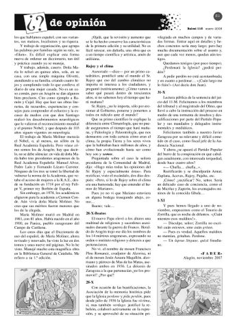 vilegiada en muchos campos y de variadas formas. Entrar aquí en detalles y hechos concretos sería muy largo; pero hay mucha documentación sobre el asunto y, aun que cada vez menos, quedan aún testigos. Quedamos testigos (por poco tiempo). ¿Perdonará la Iglesia? ¿pedirá perdón? A pedir perdón no está acostumbrada; y en cuanto a perdonar… «¡Cuán largo me lo fiáis!» (Así decía don Juan). 31-X Lectura pública de la sentencia del juicio del 11-M. Felicitamos a los miembros del tribunal y al magistrado del Olmo, que llevó a cabo la instrucción del proceso en medio de una tormenta de insultos y descalificaciones por parte del Partido Popular y sus mandados y delegados instrumentales y mediáticos. Felicitamos también a nuestro Javier Zaragoza por su relevante y difícil cometido en el caso, como fiscal jefe de la Audiencia Nacional. Y ahora ¿se apeará el Partido Popular del burro de la conspiración en que cabalgan asnalmente, con interesada terquedad, desde hace cuatro años? «— Chufla… chufla...». Rectificarán y se disculparán Aznar, Zaplana, Aceves, Rajoy, Pujalte, etc. ¡Cómo! ¿rectificar? No, señor. Sería un delicado caso de conciencia, como el de Micifuz y Zapirón, los aventajados mininos de la conocida fábula… 1-XI Y pues hemos llegado a uno de noviembre, empecemos como el Tenorio de Zorrilla, que es noche de difuntos. «¡Cuán mienten esos malditos!». — Disculpe, señor; Zorrilla no escribió cuán mienten, sino cuán gritan. — Pues es verdad. Aquellos malditos no mentían, gritaban. Perdone. — Un lapsus linguae, quizá freudiano. «F A B E R» Alagón, noviembre 2007
