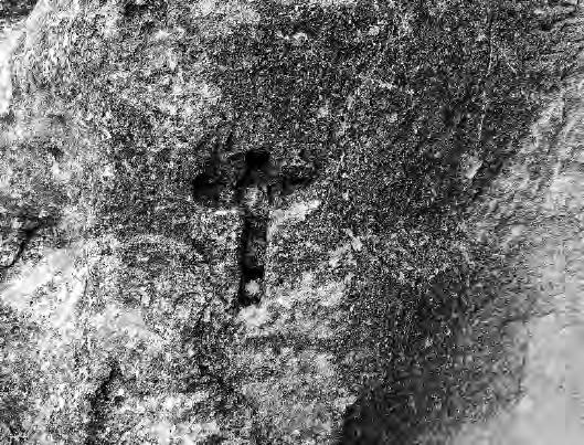 Poco antes de los dos kilómetros de caminata, al llegar a los pies de un muro fracturado de arenisca, deberemos estar atentos a nuestra izquierda, pues se distingue un sendero que asciende hasta los pies del muro. Es allí donde esta la entrada a nuestra misteriosa cueva. El vano de acceso es reducido, de unos cuarenta centímetros de ancho por poco más de metro y medio de alto. A la izquierda de dicho vano encontramos el petroglifo de una cruz. A la derecha de la puerta hay una oquedad profunda producida por la erosión.