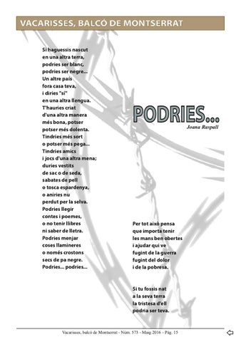 VACARISSES, BALCÓ DE MONTSERRAT Si haguessis nascut en una altra terra, podries ser blanc, podries ser negre... Un altre país fora casa teva, i diries "sí" en una altra llengua. T'hauries criat d'una altra manera més bona, potser potser més dolenta. Tindries més sort o potser més pega... Tindries amics i jocs d'una altra mena; duries vestits de sac o de seda, sabates de pell o tosca espardenya, o aniries nu perdut per la selva. Podries llegir contes i poemes, o no tenir llibres ni saber de lletra. Podries menjar coses llamineres o només crostons secs de pa negre. Podries... podries...