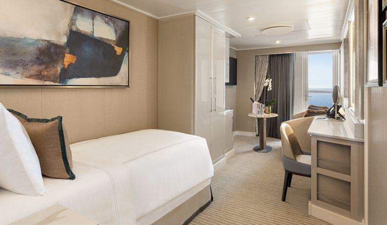 Solo travellers have a fresh reason to delight in this category of stateroom designed exclusively for them. Spacious yet cosy, the Concierge Level Solo Veranda Stateroom features a comfortable sitting area overlooking the private veranda as well as a separate sleeping area, bathroom and copious storage space. Guests also enjoy the full array of Concierge Level amenities, such as free laundry services and keycard access to the exclusive Concierge Lounge.