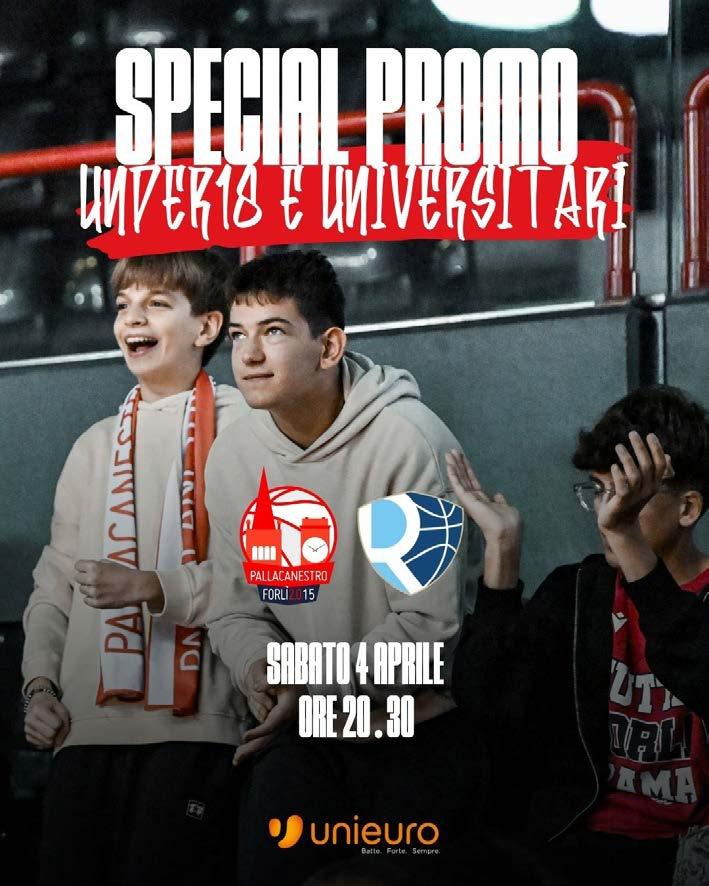In occasione di Unieuro Forlì – Pall. Roseto in programma sabato 4 aprile alle ore 20.30 all’Unieuro Arena, la Pallacanestro Forlì 2.015 chiama a raccolta i giovani forlivesi.