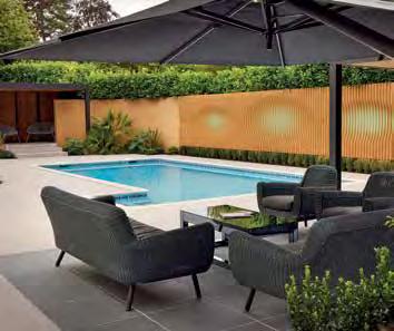 The property’s side garden was largely unused, with an existing swimming pool closed off by a large brick wall from a lower area housing a hot tub. Shrubs were unruly and the existing paving slabs old and tired. The design has transformed the area into an engaging entertaining space. The budget was maximised by reusing and cladding existing features. A new canopy houses a barbecue area adjacent to a larger seating area shaded by a Poggesi umbrella with views opened up into the lower section of the garden following the removal of the obtrusive brick wall. This area with its wood burner centrepiece is now the ultimate end-ofevening retreat.
