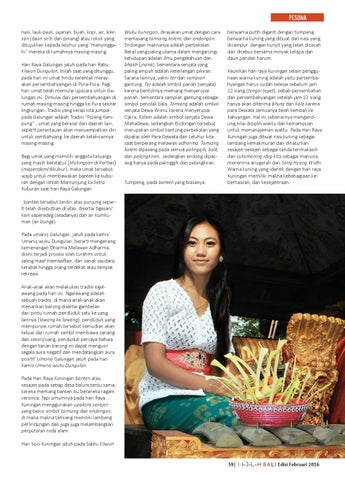 pesona nasi, lauk-pauk, jajanan, buah, kopi, air, lekesan (daun sirih dan pinang) atau rokok yang ditujukkan kepada leluhur yang “menyinggahi� mereka di rumahnya masing-masing. Hari Raya Galungan jatuh pada hari Rabu Kliwon Dungulan, Inilah saat yang ditunggu, pada hari ini umat hindu serentak merayakan persembahyangan di Pura-Pura. Pagi hari umat telah memulai upacara untuk Galungan ini. Dimulai dari persembahyangan di rumah masing-masing hingga ke Pura sekitar lingkungan. Tradisi yang kerap kita jumpai pada Galungan adalah Tradisi “Pulang Kampung� , umat yang berasal dari daerah lain, seperti perantauan akan menyempatkan diri untuk sembahyang ke daerah kelahirannya masing-masing. Bagi umat yang memiliki anggota keluarga yang masih berstatus [Makingsan di Pertiwi] (mapendem/dikubur), maka umat tersebut wajib untuk membawakan banten ke kuburan dengan istilah Mamunjung ka Setra Kuburan saat hari Raya Galungan