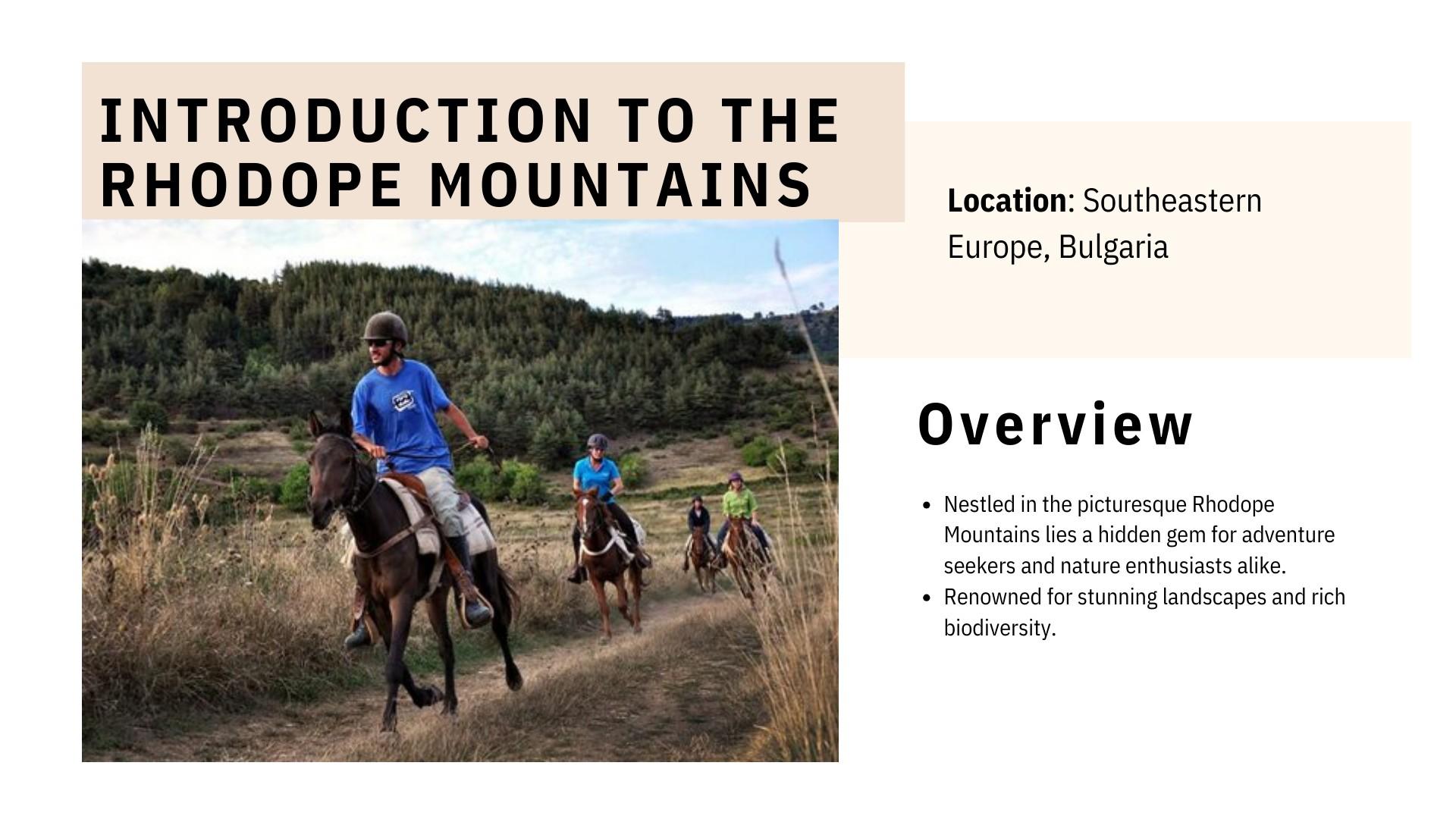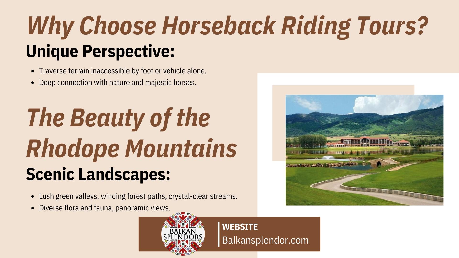Discover the enchanting Rhodope Mountains through Explore Nature with Horseback Riding tours in the Rhodope Mountains. Immerse yourself in lush valleys and winding paths, experiencing rich biodiversity and local culture. Suitable for all levels, these tours offer eco-friendly adventures supporting local communities. Prepare for a soul-stirring journey where each hoofbeat reveals Bulgaria's natural splendor and cultural heritage. Visit at: https://www.balkansplendor.com/tours/horseback-riding-tour-in-bulgaria