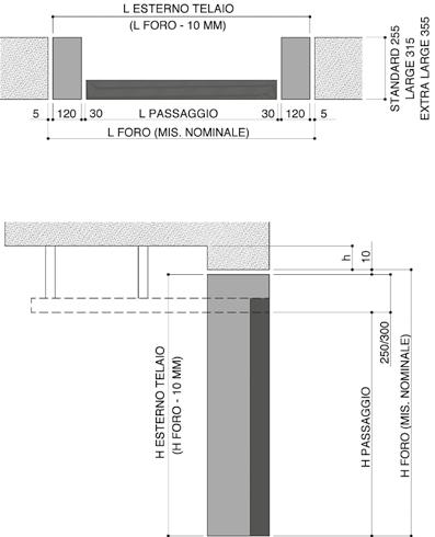 N.B.: Nella porta basculante con predisposizione alla motorizzazione HF vengono inserite nei montanti laterali della struttura delle guarnizioni in gomma che pur riducendo il passaggio di 60 mm attutiscono l’urto in caso di contatto.