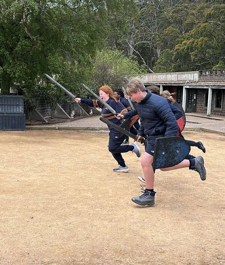 During Term 4, our Year 8 students enjoyed an excursion to Kryal Castle as part of their History studies. The day provided a rich, hands-on experience of medieval life, with students taking part in sword training, re-enacting “The Battle of Hastings”, trying on armour, experimenting as apothecaries, conducting a siege, and creating their own leather bag labels through basic leatherworking.