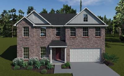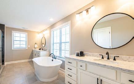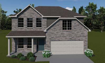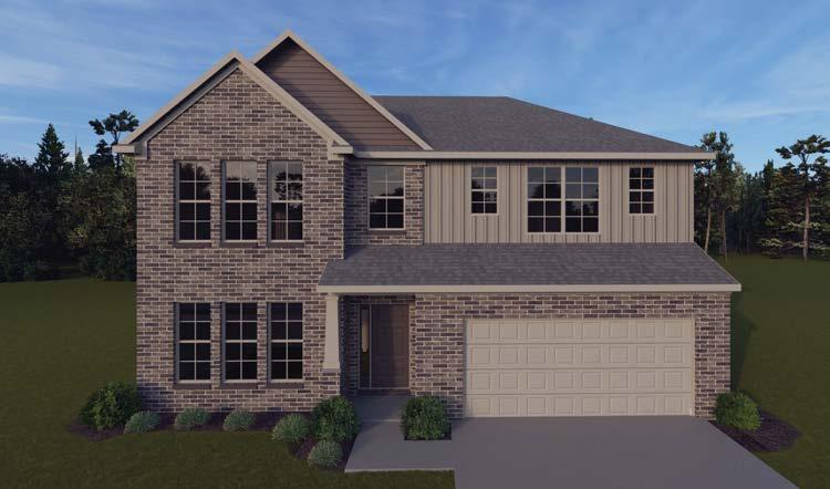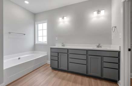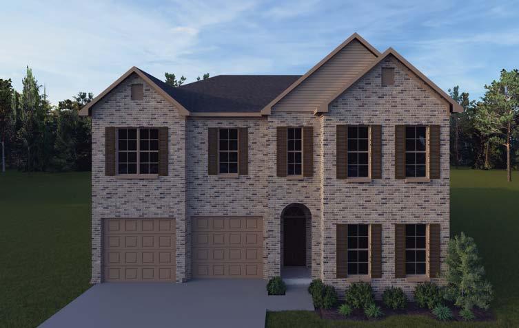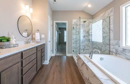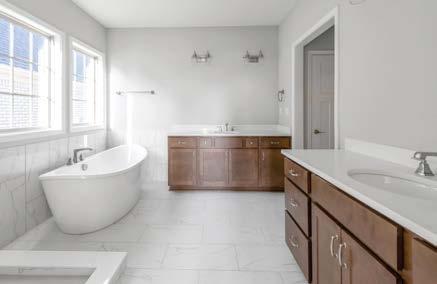Upstairs bedrooms can be configured in several ways, with four bedrooms as the standard layout. The upstairs primary bedroom suite has a spacious separate sitting area, and double doors open to the bath, which includes dual walkin closets, separate vanities, and a platform garden tub and oversized tiled shower. An expanded layout with for bedrooms 2 and 3 with walk-in closets is offered. The fourth bedroom has an option for an additional private full bath, or can be configured as a loft. An optional fifth bedroom and full bath can also be added in the second story space above the family room.