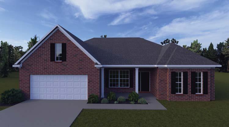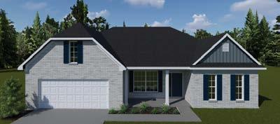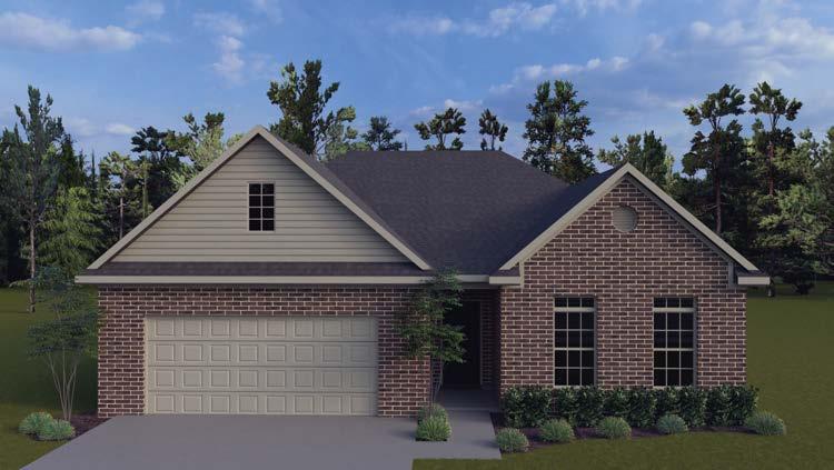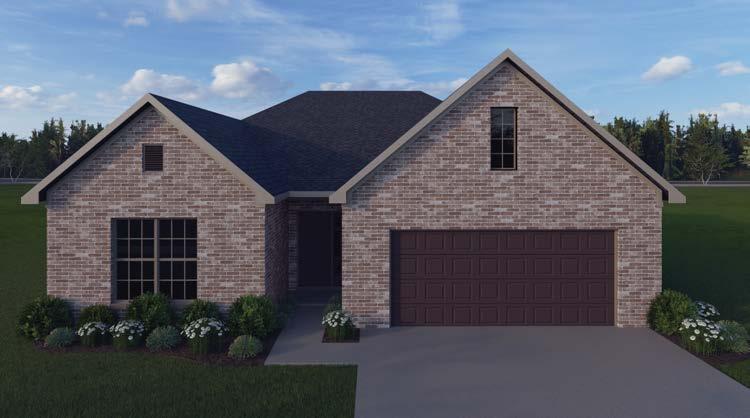 The Kingsley plan is an open layout ranch with three bedrooms and two baths. A second floor bonus room option is available, and half bath option is offered. An optional fourth bedroom, full bath, and loft is also possible, and walk-in attic storage is included with all bonus room options The large family room and flex area are open to one another, and connected to the kitchen with a serving/dining counter. The breakfast area is surrounded by natural light. A covered patio is included at the rear of the home and sheltered by the primary bedroom and breakfast area wings of the house for maximum privacy. The garage connects to the house via the utility room, and a pantry, coat closet and optional drop zone keep everyone organized entering the kitchen and living spaces of the home. The primary bedroom suite overlooks the rear yard and includes a spacious bedroom, a luxury bath with garden tub, separate shower, feature window, double vanity, enclosed commode with linen closet, and a large closet. A four foot extension of the primary bedroom is available. Additional luxury bath options are offered. Bedrooms two and three share a bath and are accessed by a hall off the entry. Exterior details include a hip roof and covered entry.
