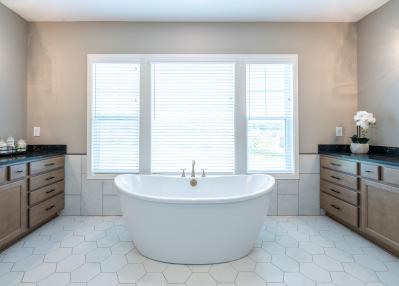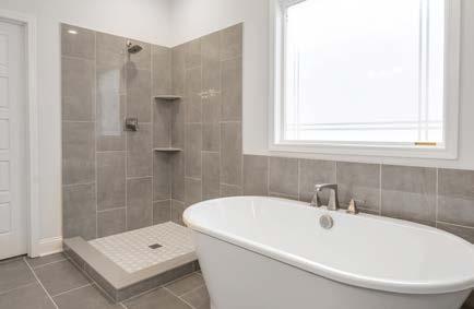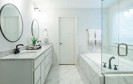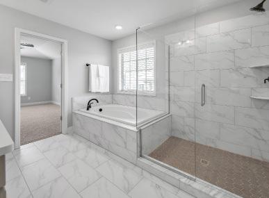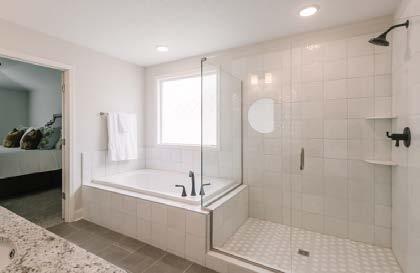 Create a luxury bath retreat with tiled whirlpool or garden tub, or standalone tub, paired with an oversized tiled shower, available per plan. Customize with expressive floor and wall tiles, shower options, and the perfect lighting.