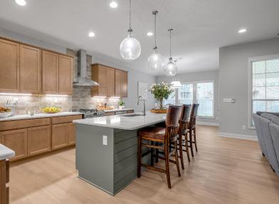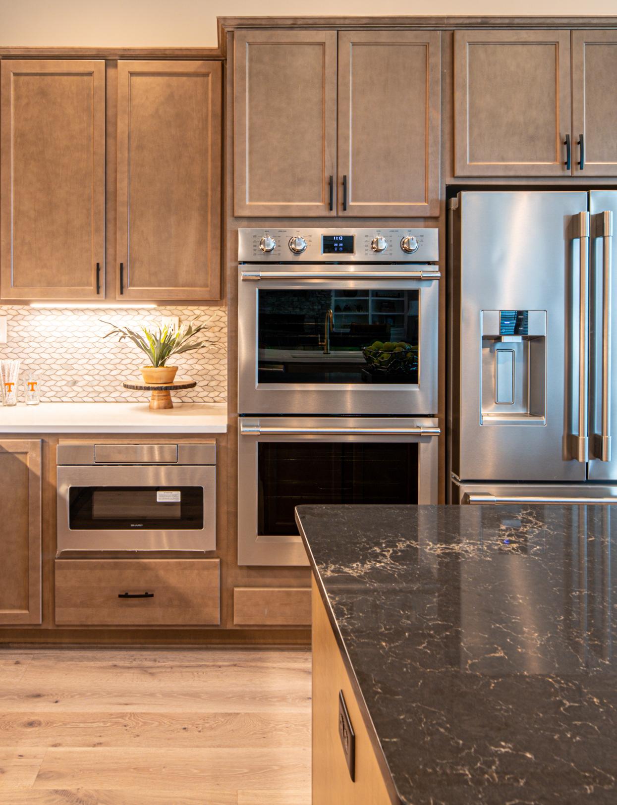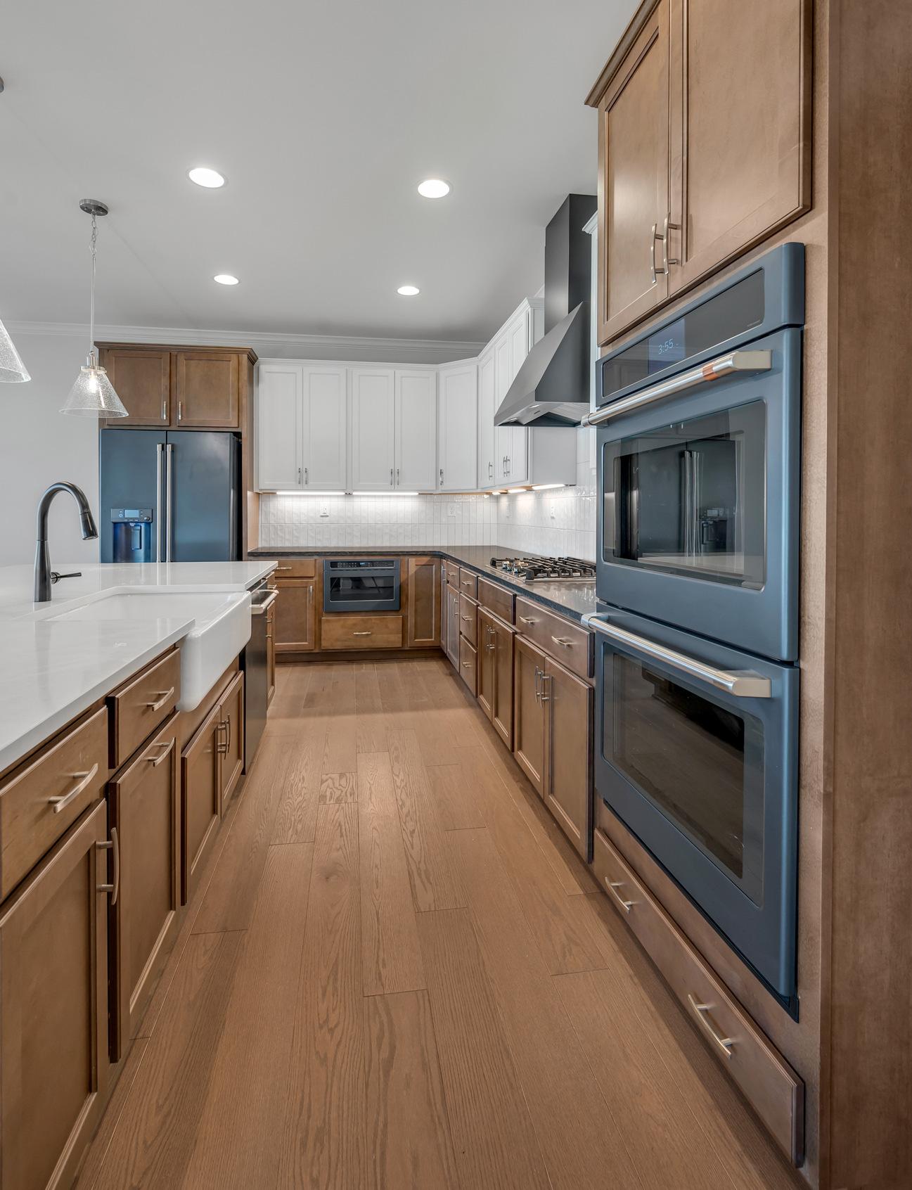 Customize a gourmet kitchen with dual tone cabinetry, glass doors, chimney hood and wall oven layouts. Make a statement with our huge selection of accent tiles in an array of vibrant and classic colors, plus expressive lighting options, quartz and granite countertops, farmhouse sinks, and much more.