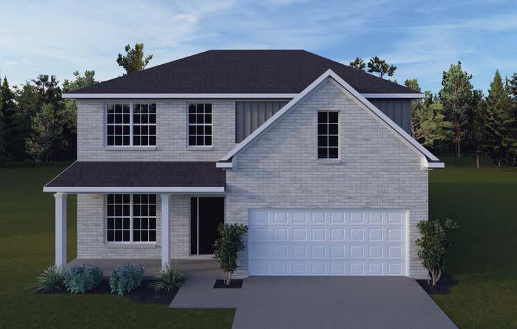 The Lowery is a traditional two-story plan with a flex area off the entry and a large family room with optional fireplace opening to the island kitchen and sunny breakfast area. A first floor guest suite is tucked away at the rear of the home and a mudroom with optional drop zone conveniently connects the garage to the family room. Upstairs, there are four large bedrooms and a centrally located utility room with folding area. The upstairs primary suite features vaulted ceilings, a luxurious bath with double bowl vanity, walk-in shower, separate tub, and spacious walk-in closet. Additional features include a covered front porch and hip roof design.