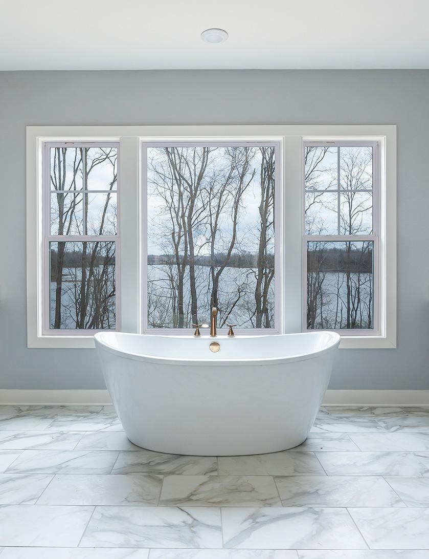 Luxury bath layouts included or available options per plan, including tiled whirlpool and garden tubs, oversized tiled showers, corner tubs, standalone tubs, separate or oversized vanities, picture or transom windows, and more.