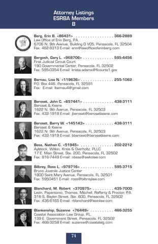 Beroset, John C. <657441> . . . . . . . . . . . . . 438-3111 Beroset & Keene 1622 N. 9th Avenue, Pensacola, FL 32503 Fax: 432-1919 E-mail: jberoset@berosetkeene.com Beroset, Barry W. <145143> . . . . . . . . . . . . 438-3111 Beroset & Keene 1622 N. 9th Avenue, Pensacola, FL 32503 Fax: 432-1919 E-mail: bberoset@berosetkeene.com Bess, Nathan C. <51945> . . . . . . . . . . . . . . 202-2212 Aylstock, Witkin, Kreis & Overholtz, PLLC 17 E. Main Street, Ste. 200, Pensacola, FL 32502 Fax: 916-7449 E-mail: nbess@awkolaw.com Bilbrey, Ross L. <979716> . . . . . . . . . . . . . . 595-3715 Bruno Juvenile Justice Center 1800 Saint Mary Avenue, Pensacola, FL 32501 Fax: 5950451 E-mail: ross@bilbreylaw.com Blanchard, M. Robert <370975> . . . . . . . . . 435-7000 Levin, Papantonio, Thomas, Mitchell, Rafferty & Proctor, P.A. 316 S. Baylen Street, Ste. 600, Pensacola, FL 32502 Fax: 436-6165 E-mail: rblanchard@levinlaw.com Blankenship, Suzanne <76449> . . . . . . . . . . 466-3255 Coastal Association Law Group, P.L. 139 E. Government Street, Pensacola, FL 32502 Fax: 466-3258 E-mail: suzanne@coastalalg.com