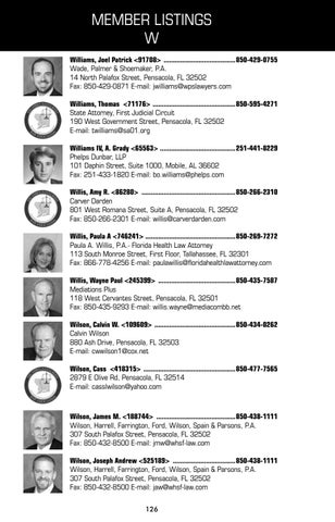 Member Listings Member Listings x w Williams, Joel Patrick <91708> ........................................850-429-0755 Wade, Palmer & Shoemaker, P.A. 14 North Palafox Street, Pensacola, FL 32502 Fax: 850-429-0871 E-mail: jwilliams@wpslawyers.com Williams, Thomas <71176> . ............................................850-595-4271 State Attorney, First Judicial Circuit 190 West Government Street, Pensacola, FL 32502 E-mail: twilliams@sa01.org Williams IV, A. Grady <65563> . ........................................251-441-8229 Phelps Dunbar, LLP 101 Daphin Street, Suite 1000, Mobile, AL 36602 Fax: 251-433-1820 E-mail: bo.williams@phelps.com Willis, Amy R. <86280> ....................................................850-266-2310 Carver Darden 801 West Romana Street, Suite A, Pensacola, FL 32502 Fax: 850-266-2301 E-mail: willis@carverdarden.com Willis, Paula A <746241> .................................................850-269-7272 Paula A. Willis, P.A.- Florida Health Law Attorney 113 South Monroe Street, First Floor, Tallahassee, FL 32301 Fax: 866-778-4256 E-mail: paulawillis@floridahealthlawattorney.com Willis, Wayne Paul <245399> ...........................................850-435-7587 Mediations Plus 118 West Cervantes Street, Pensacola, FL 32501 Fax: 850-435-9293 E-mail: willis.wayne@mediacombb.net Wilson, Calvin W. <109609> .............................................850-434-0262 Calvin Wilson 880 Ash Drive, Pensacola, FL 32503 E-mail: cwwilson1@cox.net Wilson, Cass <418315> ...................................................850-477-7565 2879 E Olive Rd, Pensacola, FL 32514 E-mail: casslwilson@yahoo.com