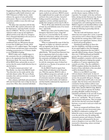 Neighborhood Watches, Medical Reserve Corps (to supplement public health initiatives), and VIPS (Volunteers in Public Service, which enhances the capacity of state and local law enforcement). There is a version of the 21-hour curriculum available to teens who wish to get involved too. “We deliver that curriculum with the help of the sheriff’s office and law enforcement and fire departments,” said Greg Strader, executive director of BRACE. “We have a team of willing volunteers ready to step up and supplement official activities in the wake of an emergency. Over a thousand individuals in the area serve as members of Citizen Corps.” Following the 2014 flood, BRACE coordinated with over 500 partners that put in more than 92,000 hours of work, which translates to a $2.1 million impact. They mopped out 592 homes and did some major construction, including reconstruction on 113 homes, thanks to over $700,000 in funding. BRACE makes such a tangible impact in the community that city councilpeople have given to the organization from their $10,000 discretionary funds. The county also realizes all the BRACE does, and provides an array of services that the county would otherwise have to take the lead on. “It’s hard to measure prevention,” said Buzz Ritchie, vice chair of the BRACE board. “You often don’t see the results and the value until after disaster strikes. We react to floods, tornadoes, fires, and even terrorism—so much more than hurricanes.” After a disaster, individuals and communities will come forward who want to help, but they are unsure how. Often, these untrained individuals